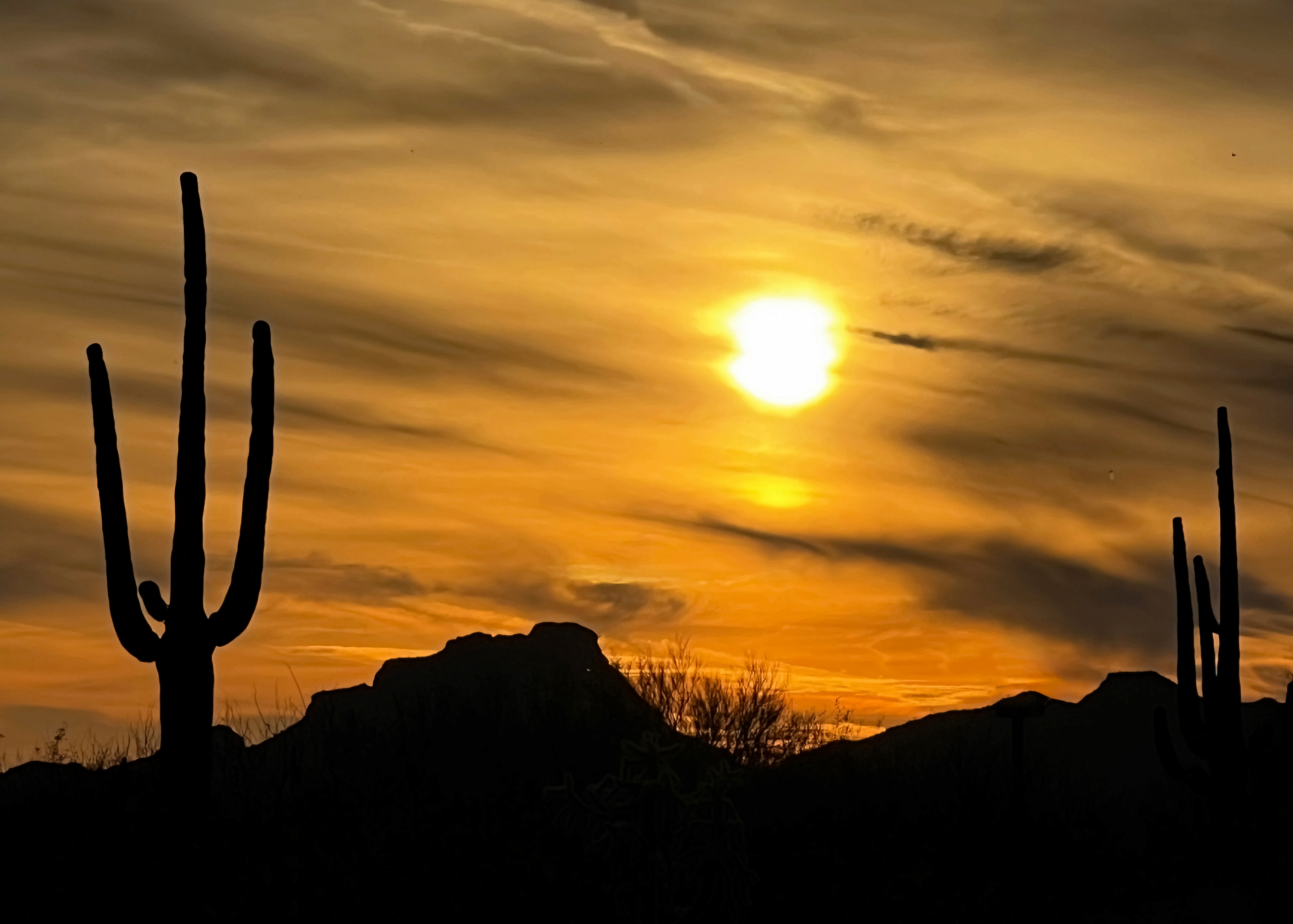 The setting of the day with Red Mountain/Saguaro cactus silhouette.