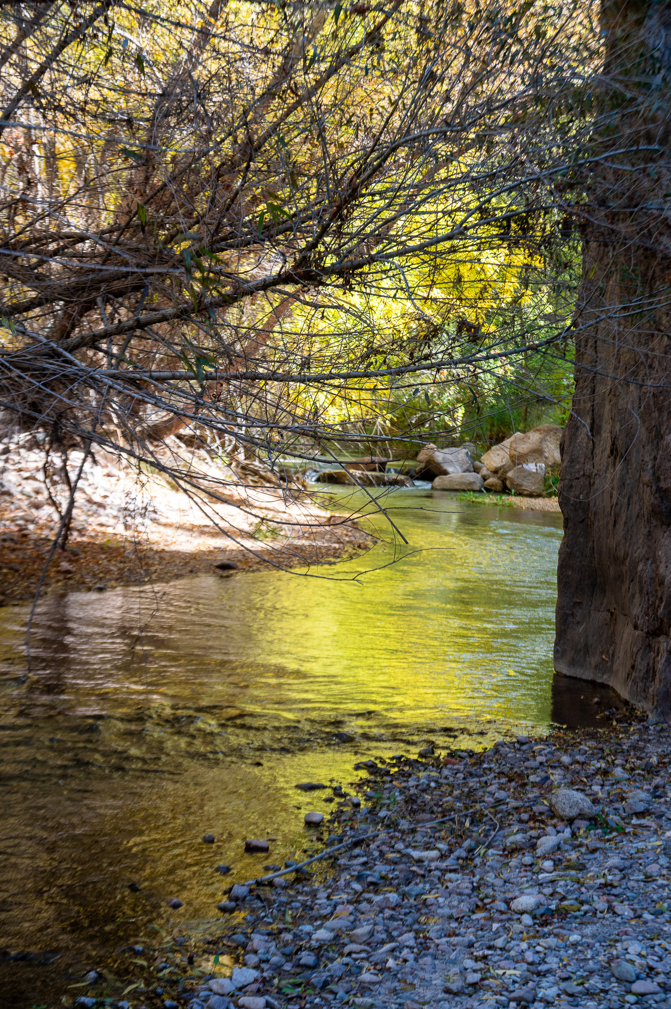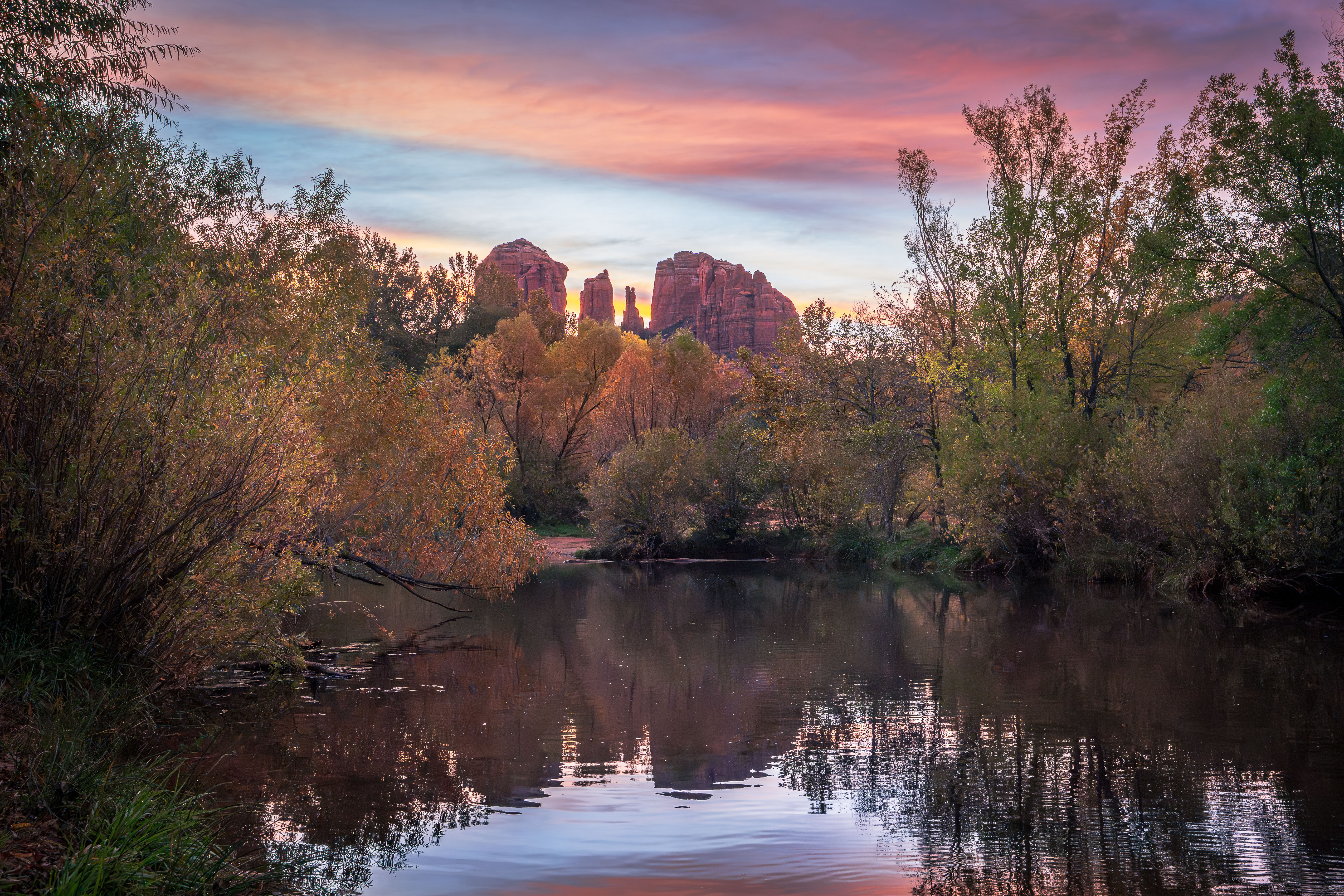 Early fall sunrise over Cathedral Rock, reflected in the calm waters of Oak Creek at Crescent Moon Ranch.