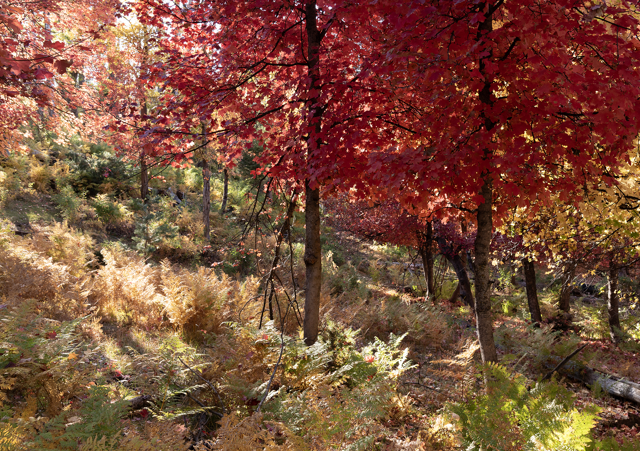 Backlit maples and ferns glow in the sunlight during the Autumn season.