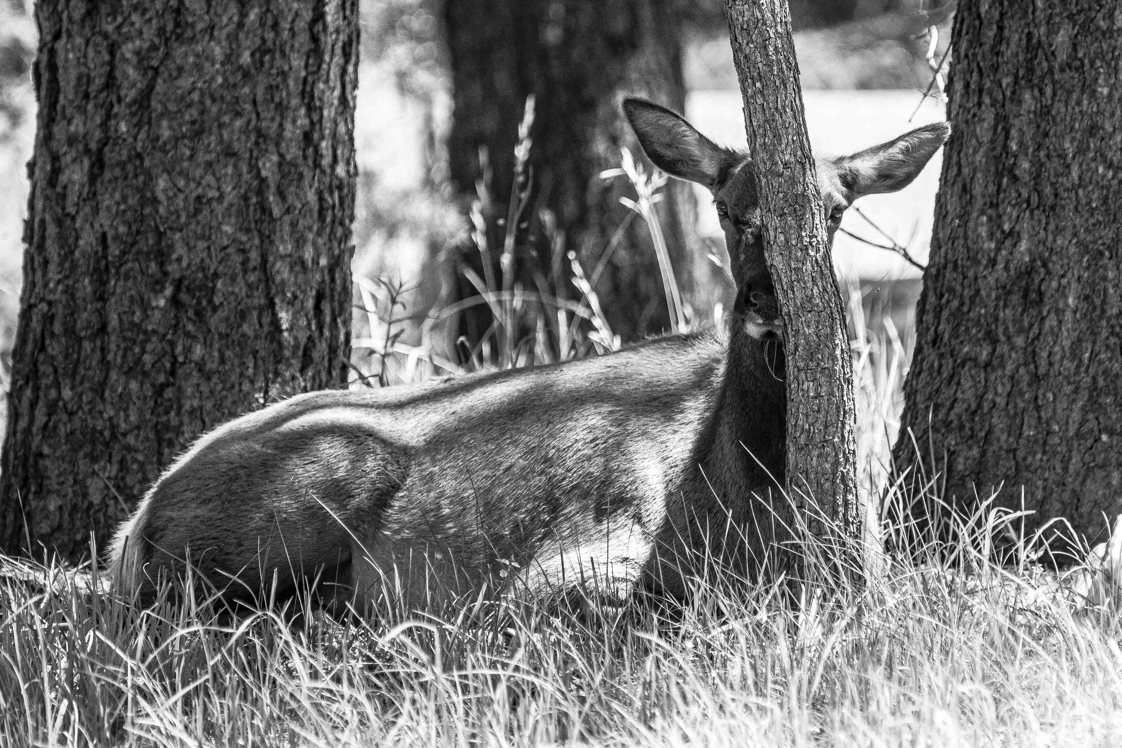 Photograph captured an elk cow cooling herself from the intense Arizona sun. She watch me intently while tested her limits as I encroached closer to her.