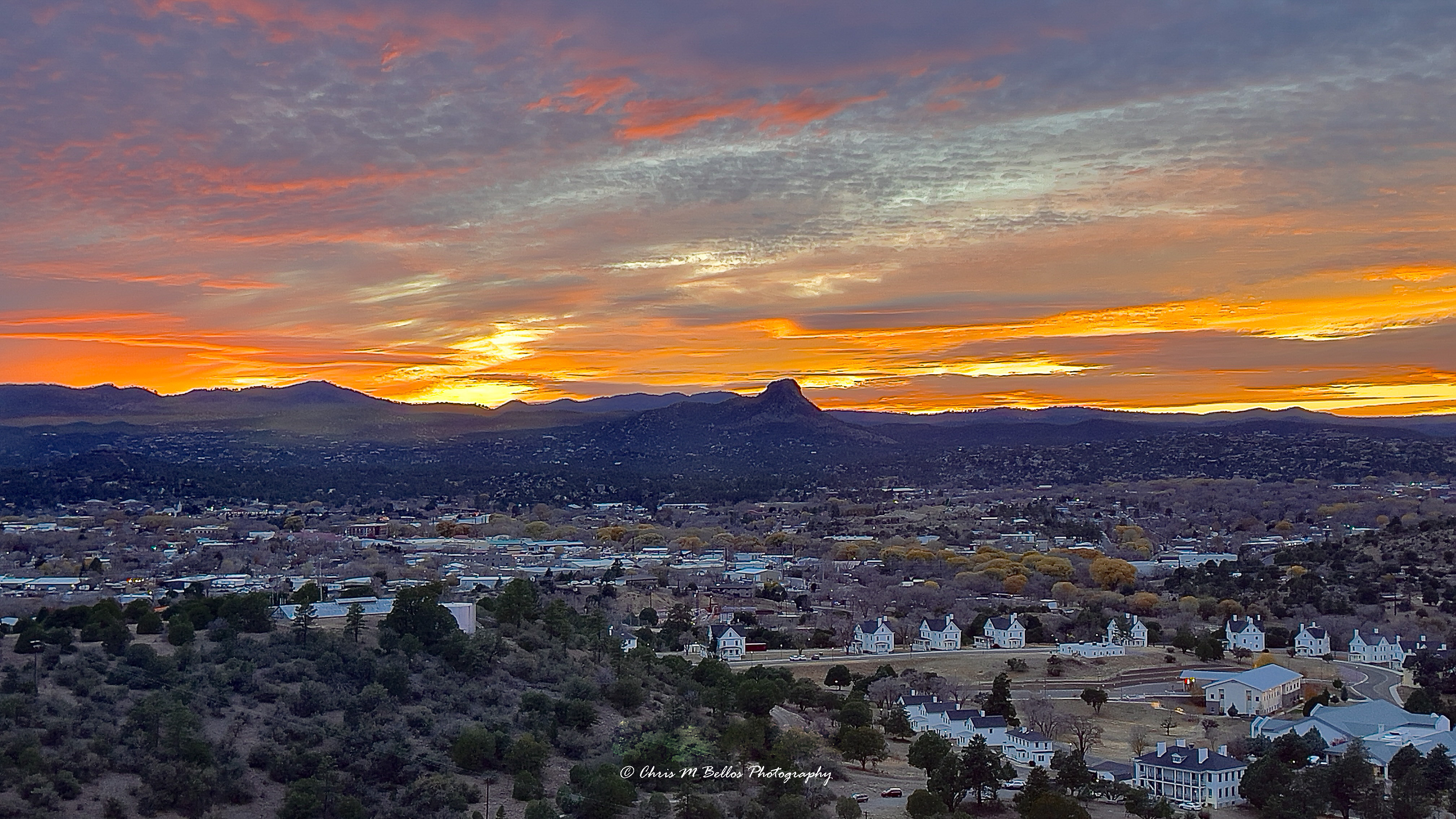 Picture of the Prescott, Arizona, With the VA Medical Center in the foreground and Thumb Butte in background at sunset.