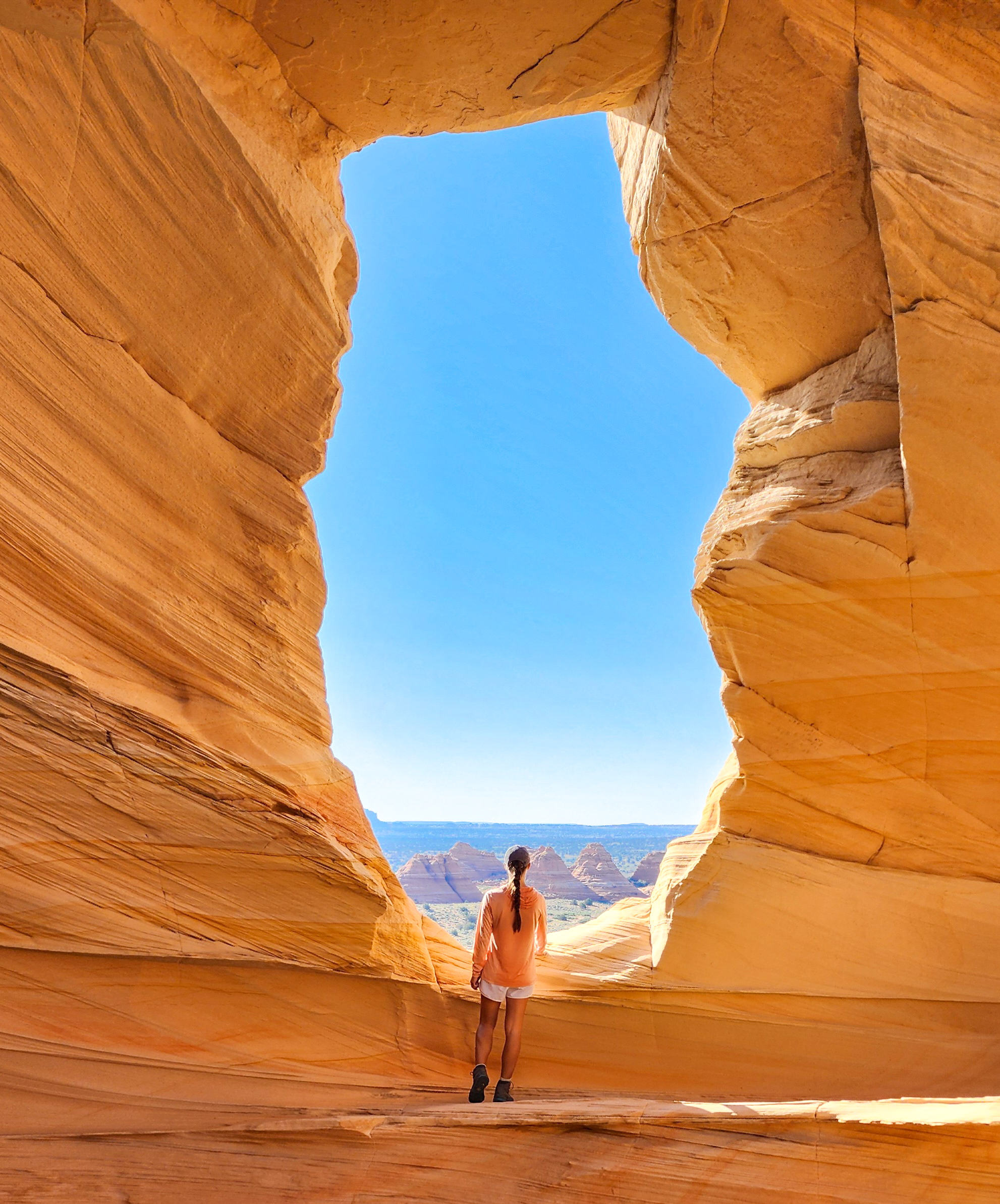 Solo hiker peeks through window arch to observe the vast Arizona desert