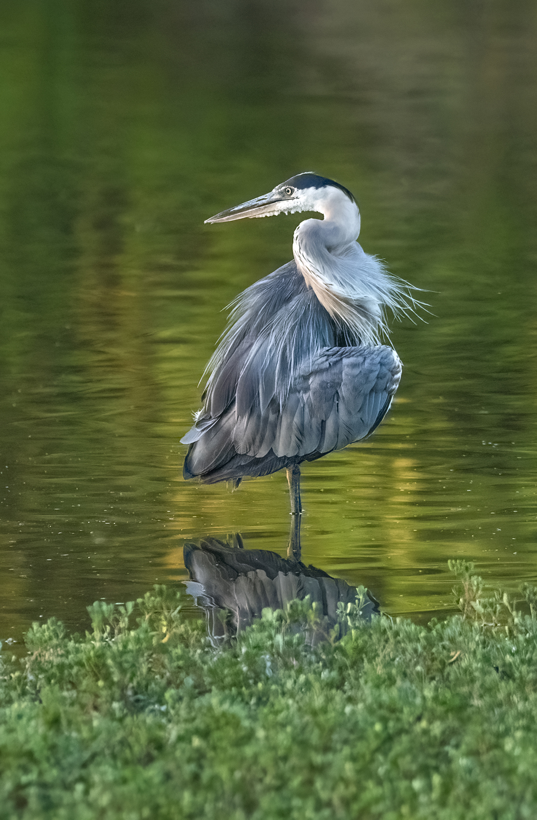 A Snowy Egret raises its head feathers in response to activity on the pond. Most likely, it was detecting another Snowy Egret heading in its direction.