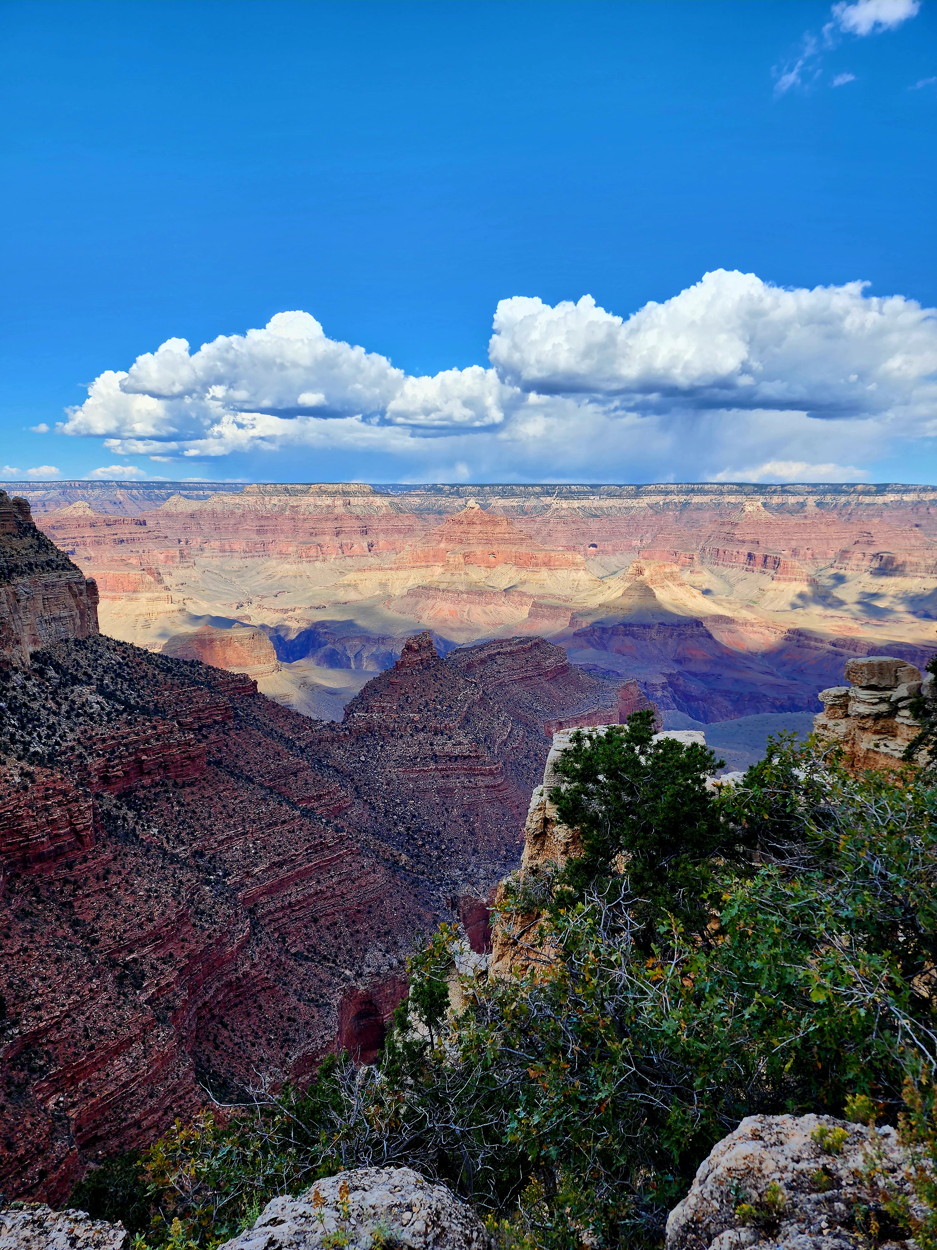 View of Grand Canyon with scattered raining storm clouds against horizon.