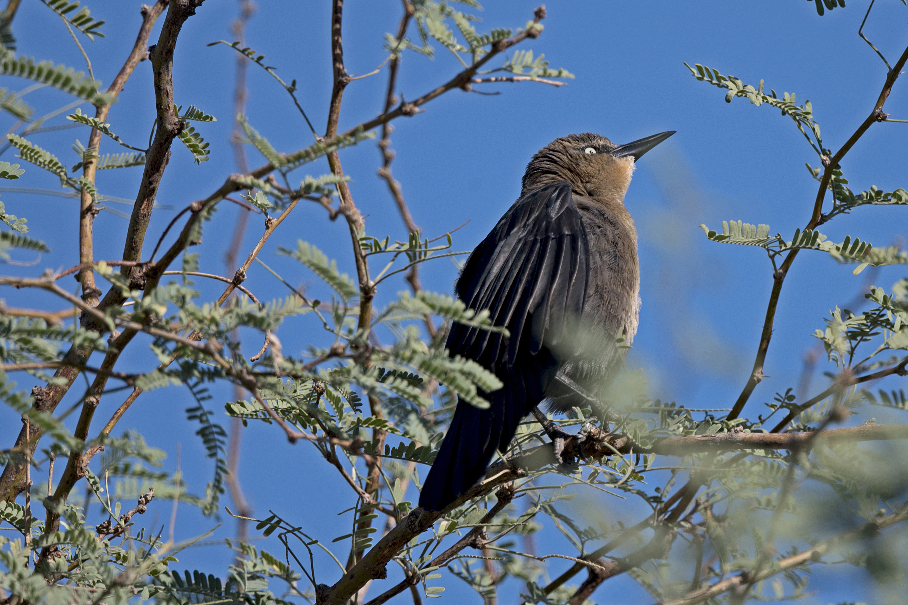 Curious bird looking up toward sky sitting on a tree inside Riparian Preserve, Gilbert.