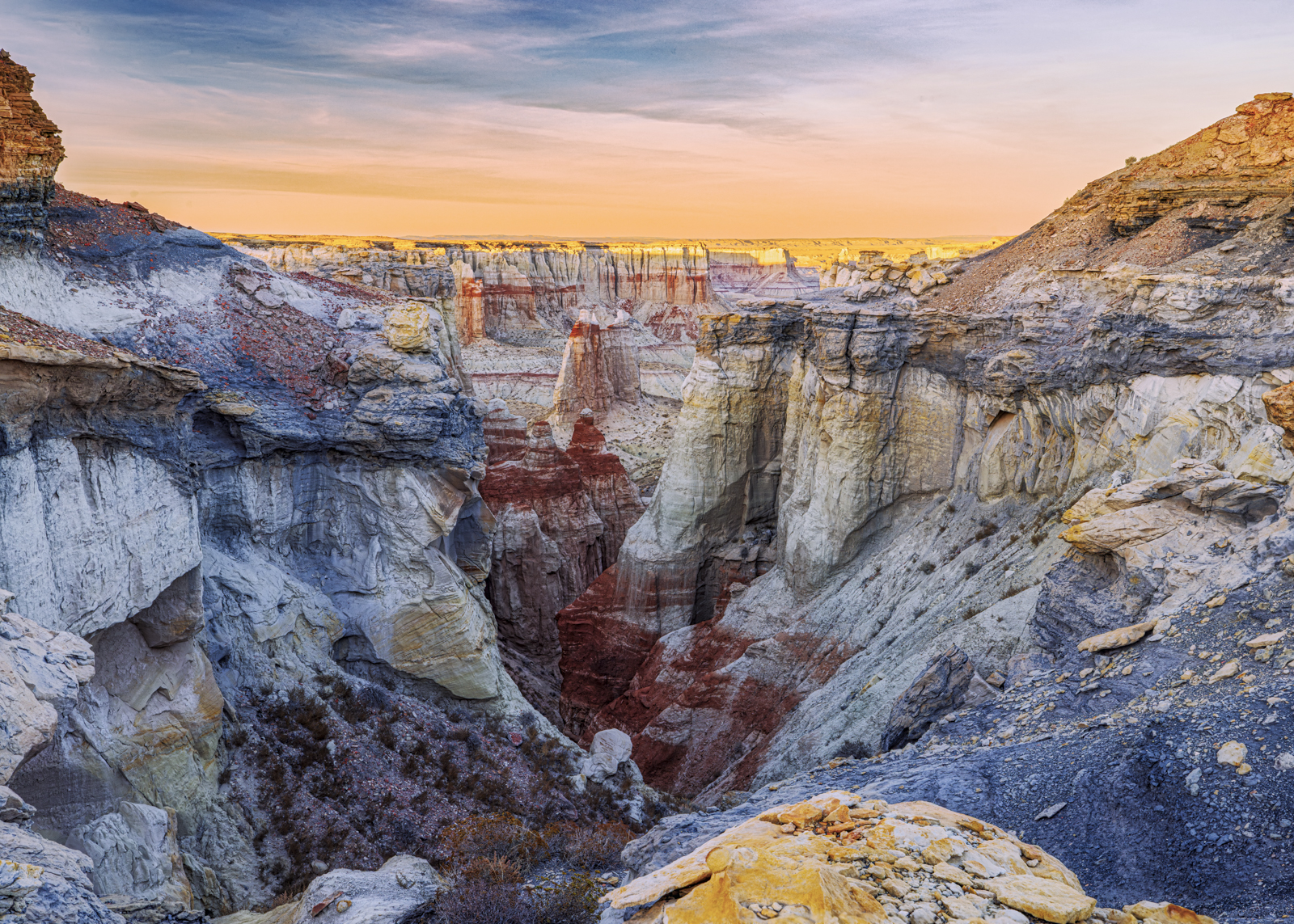 This golden illumination transforms the rugged Coal Mine Canyon below, casting warm, inviting hues over its deep crevices and intricate rock layers.