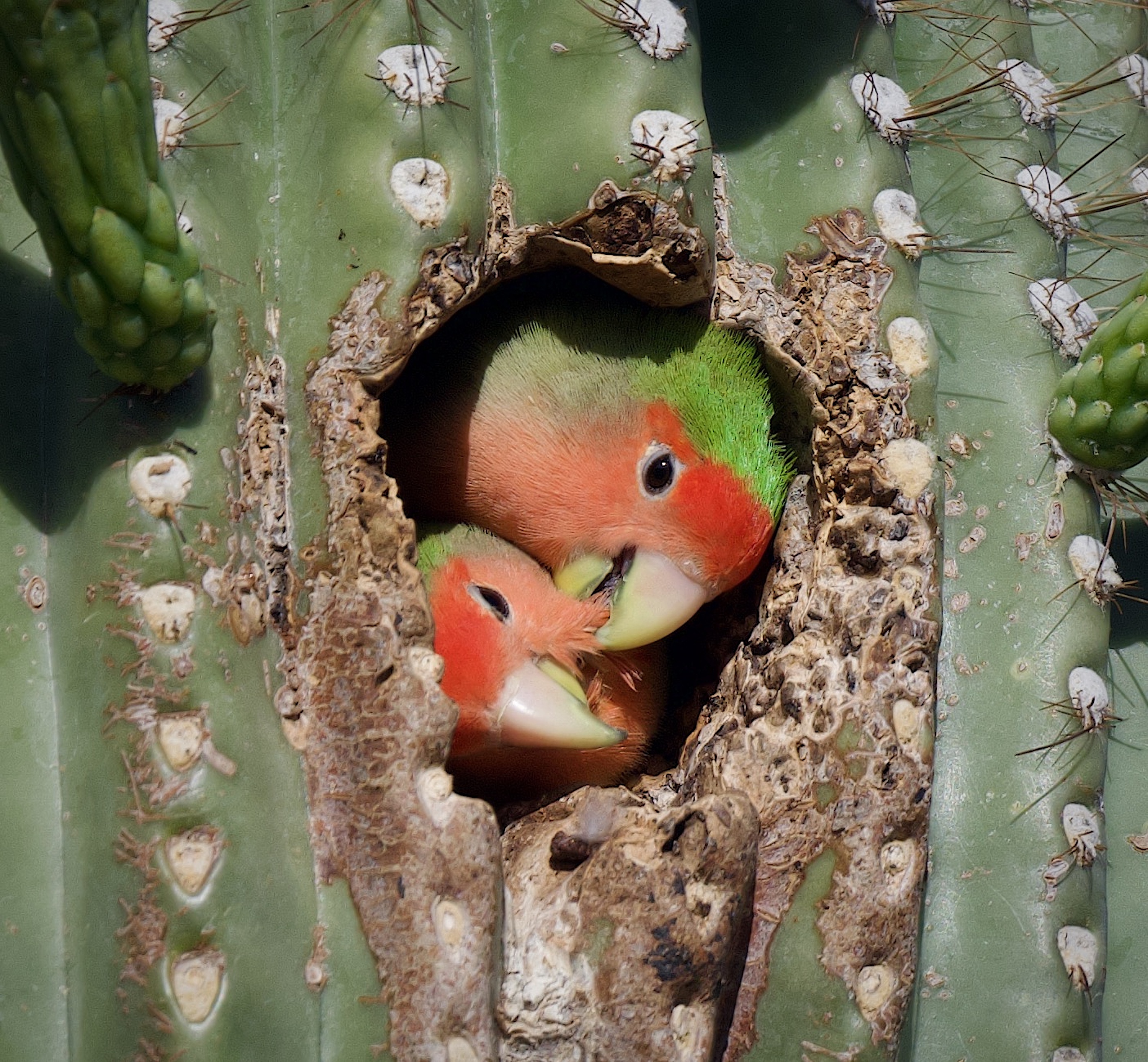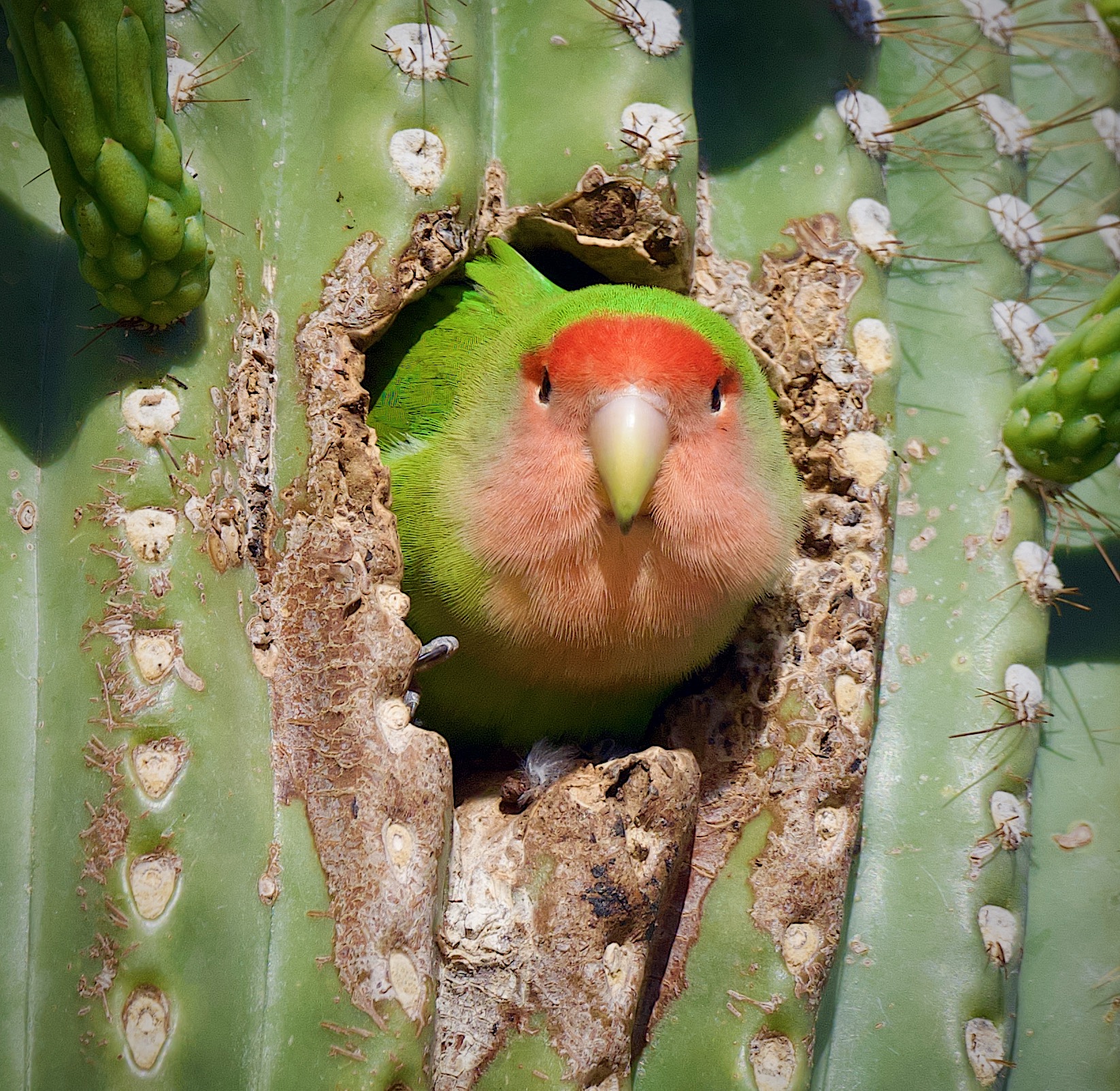 A "Cheeky" Peach Faced Lovebird peeking out of it's Saguaro Cactus nest !