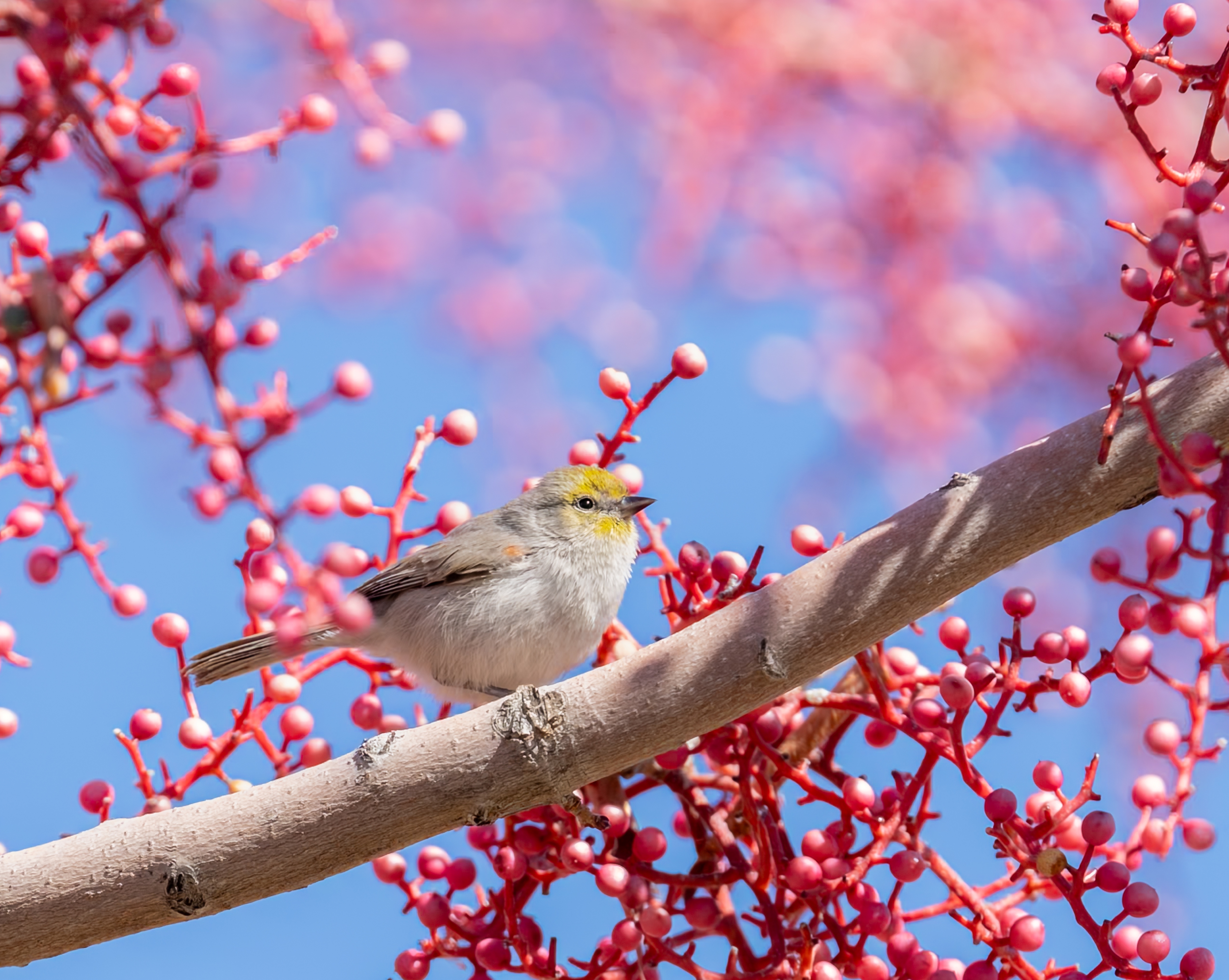 A verdin pauses on a branch of the colorful pink fruit-bearing pistache tree in Lakeside Park