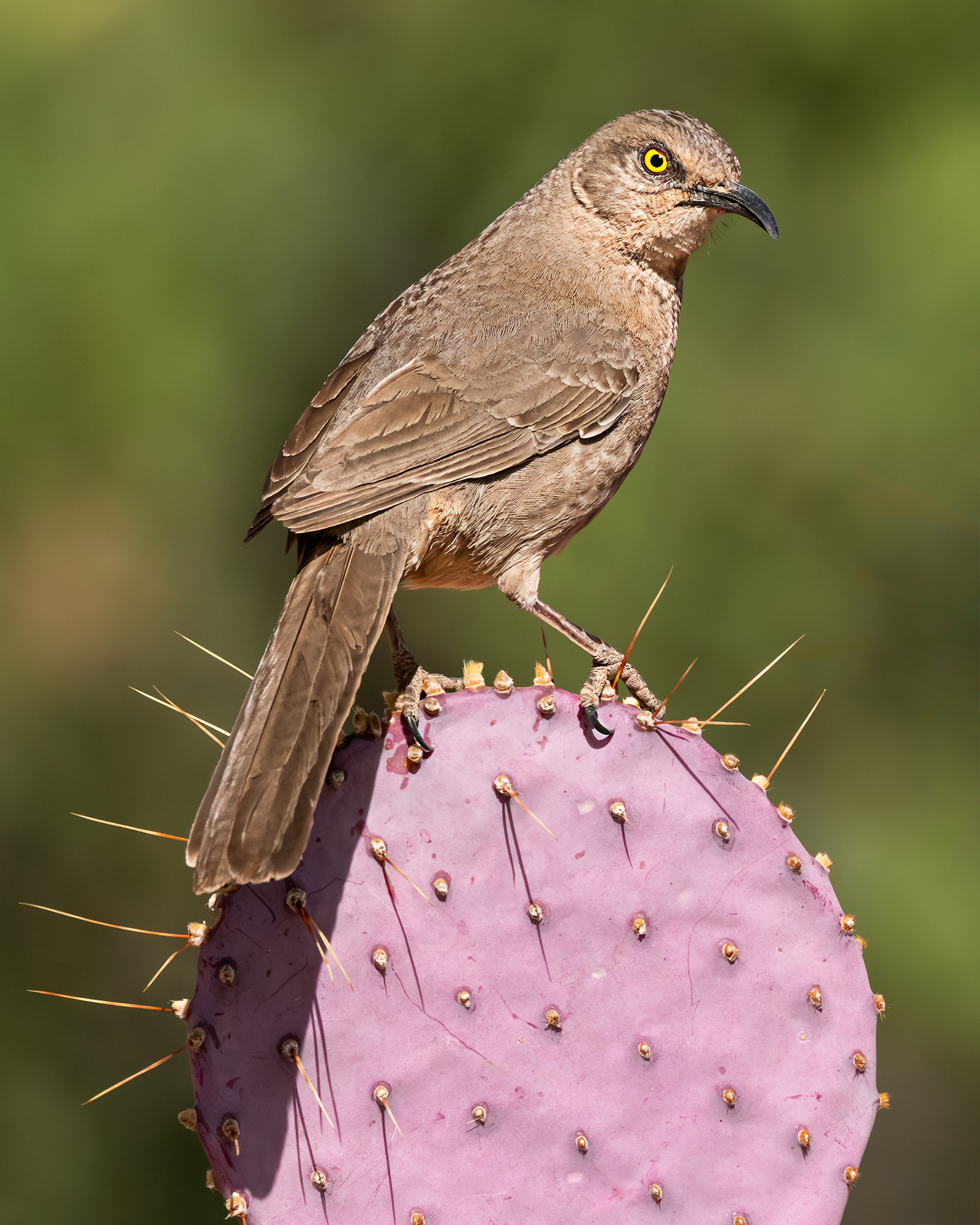 A Curve-billed Thrasher pauses on a purple prickly pear pad at late sunrise in southern Arizona, its bright eye catching the first warm light of the morning.