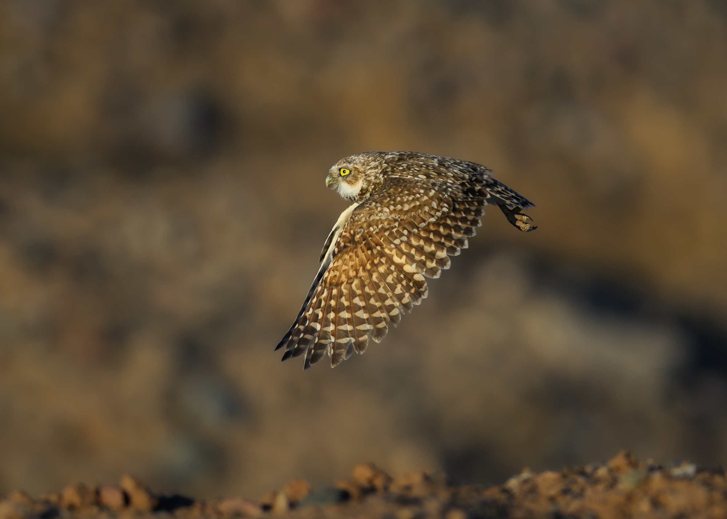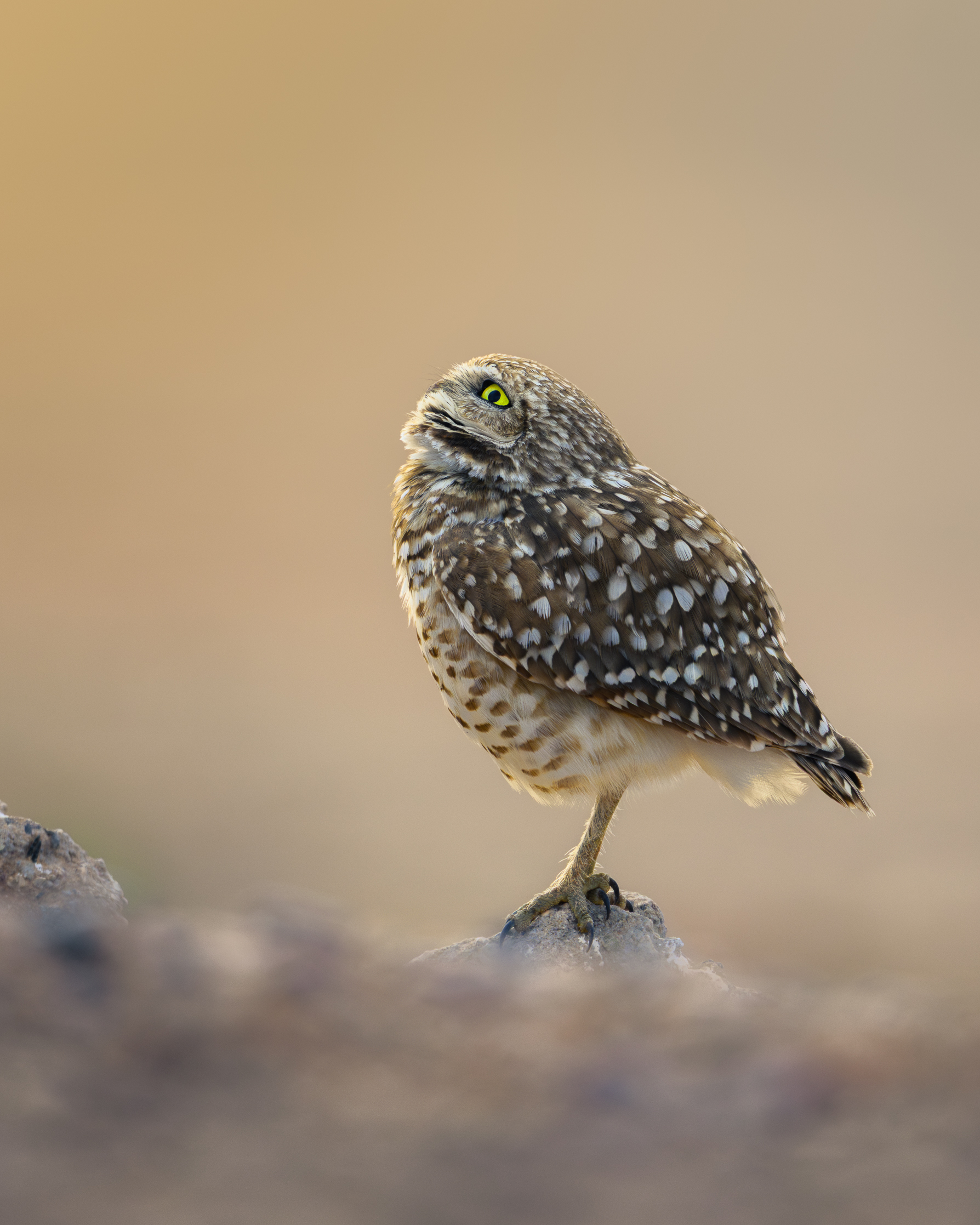 A Burrowing Owl watching a hawk fly overhead in the early morning hours of the Sonoran Desert.