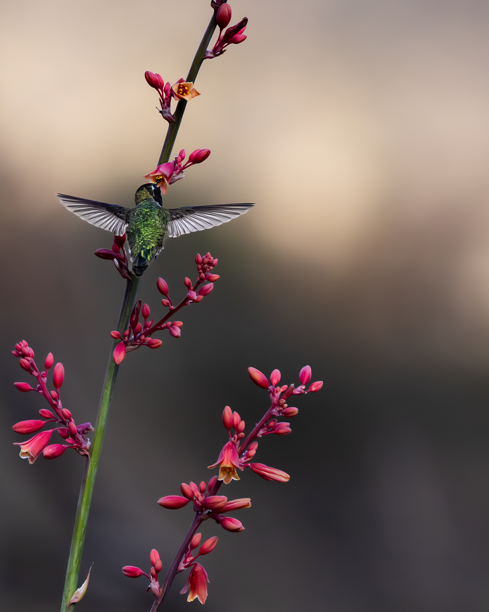 At cold sunrise in the Santa Rita Mountains, a hummingbird hovers among blooming desert stalks, its wings catching the soft morning light as it feeds from the first flowers of the day.