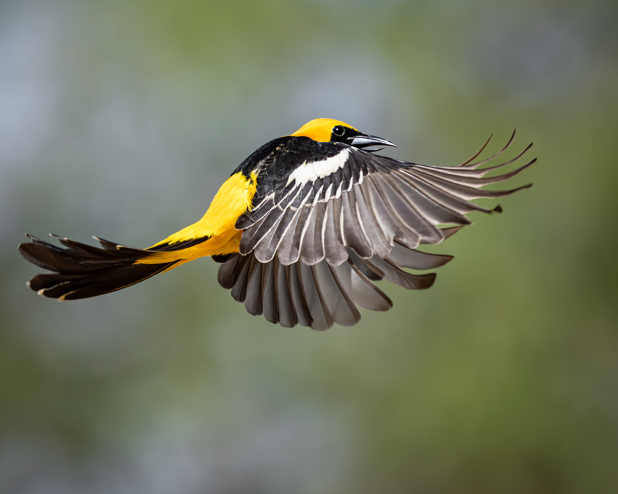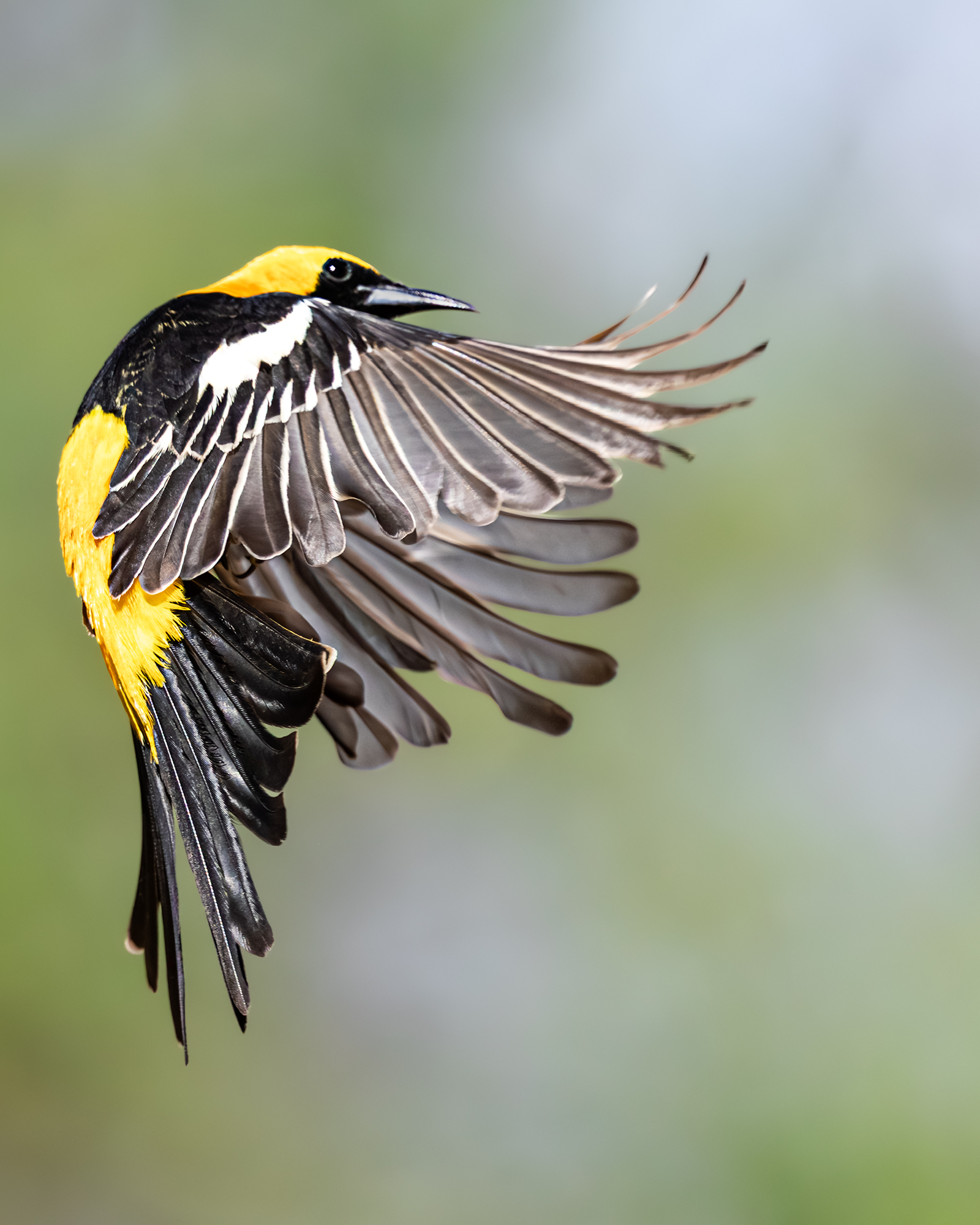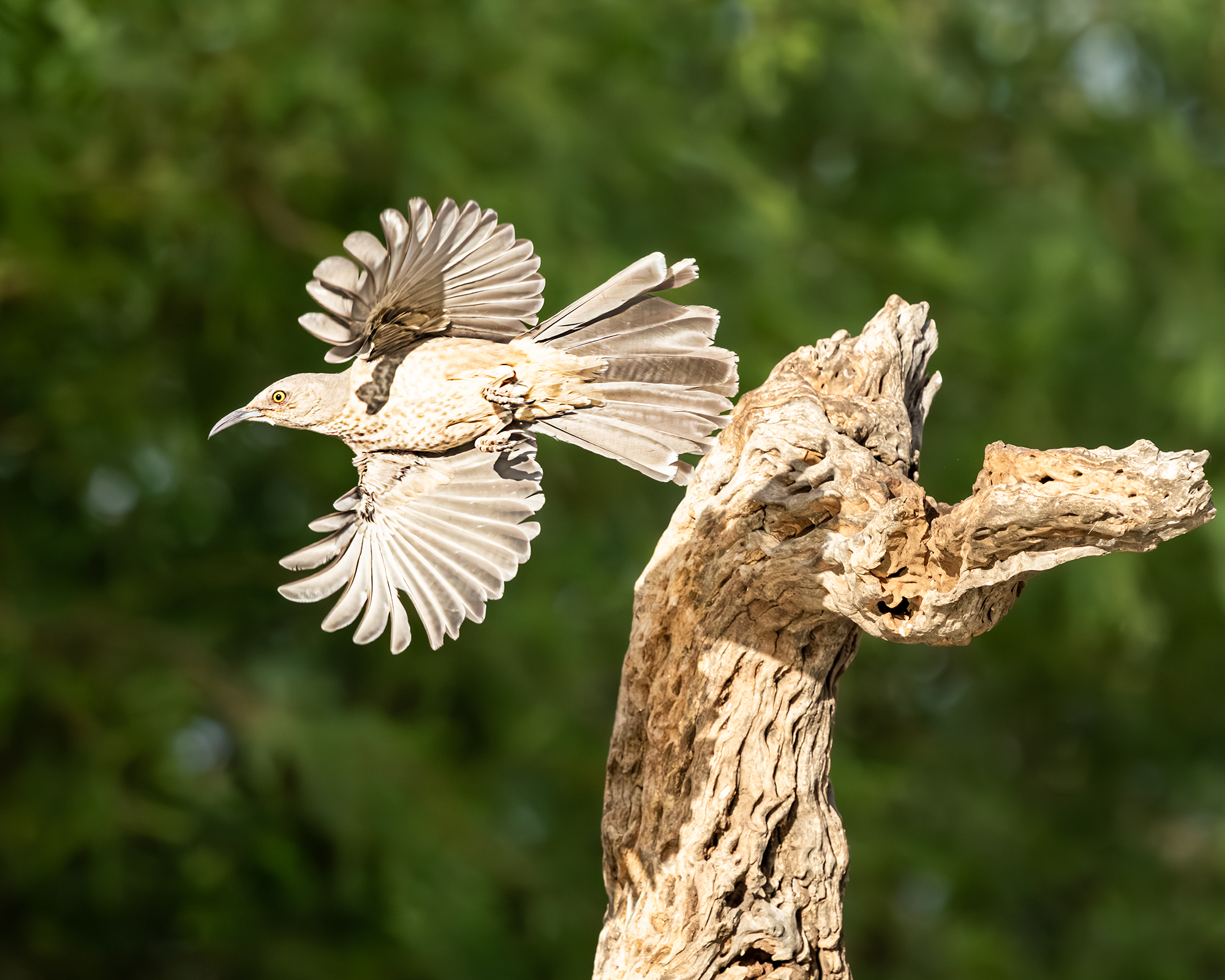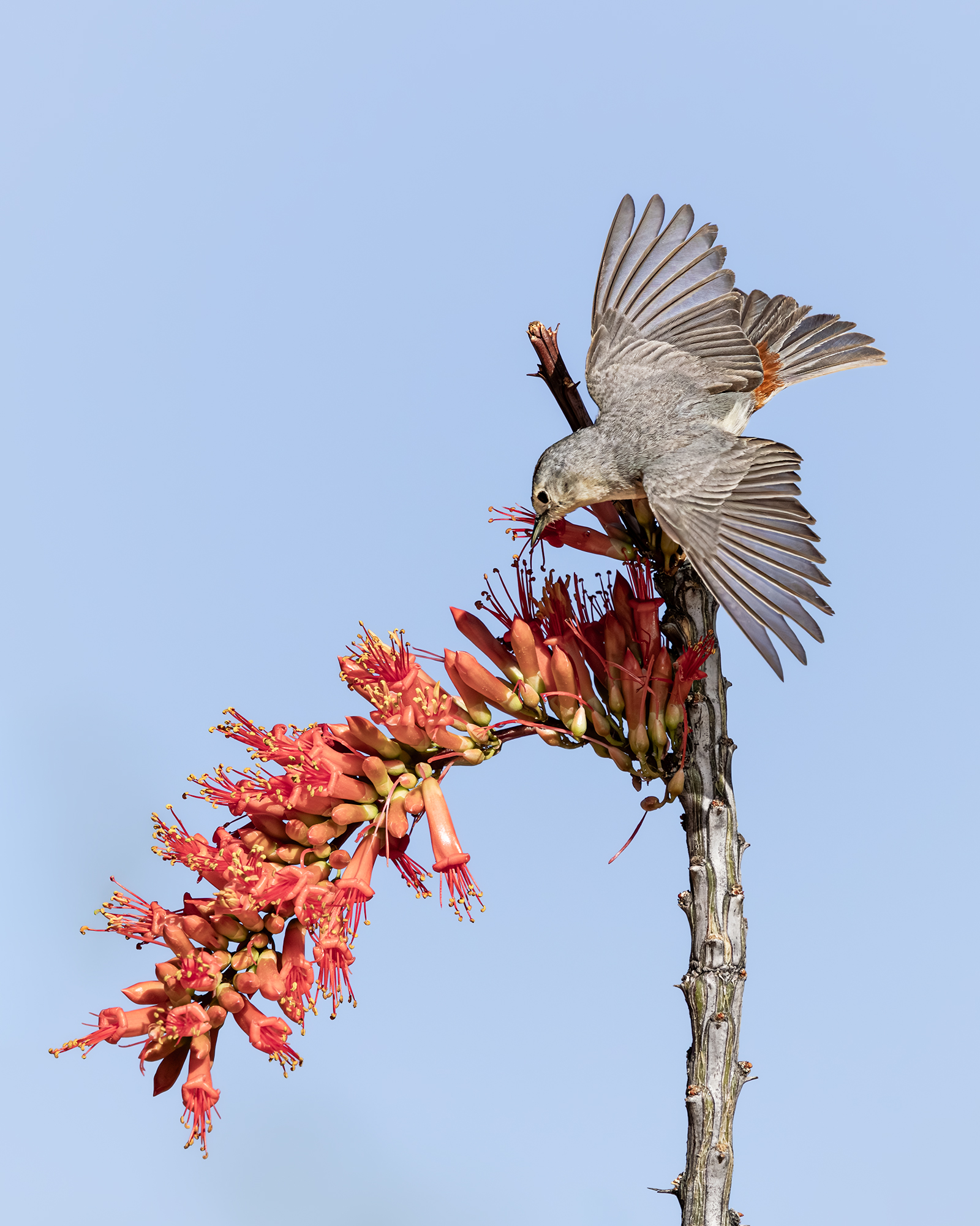 At sunrise in Green Valley, a Lucy’s Warbler feeds among the blossoms of a blooming ocotillo, its wings fanned wide as it hovers over the bright desert flowers.