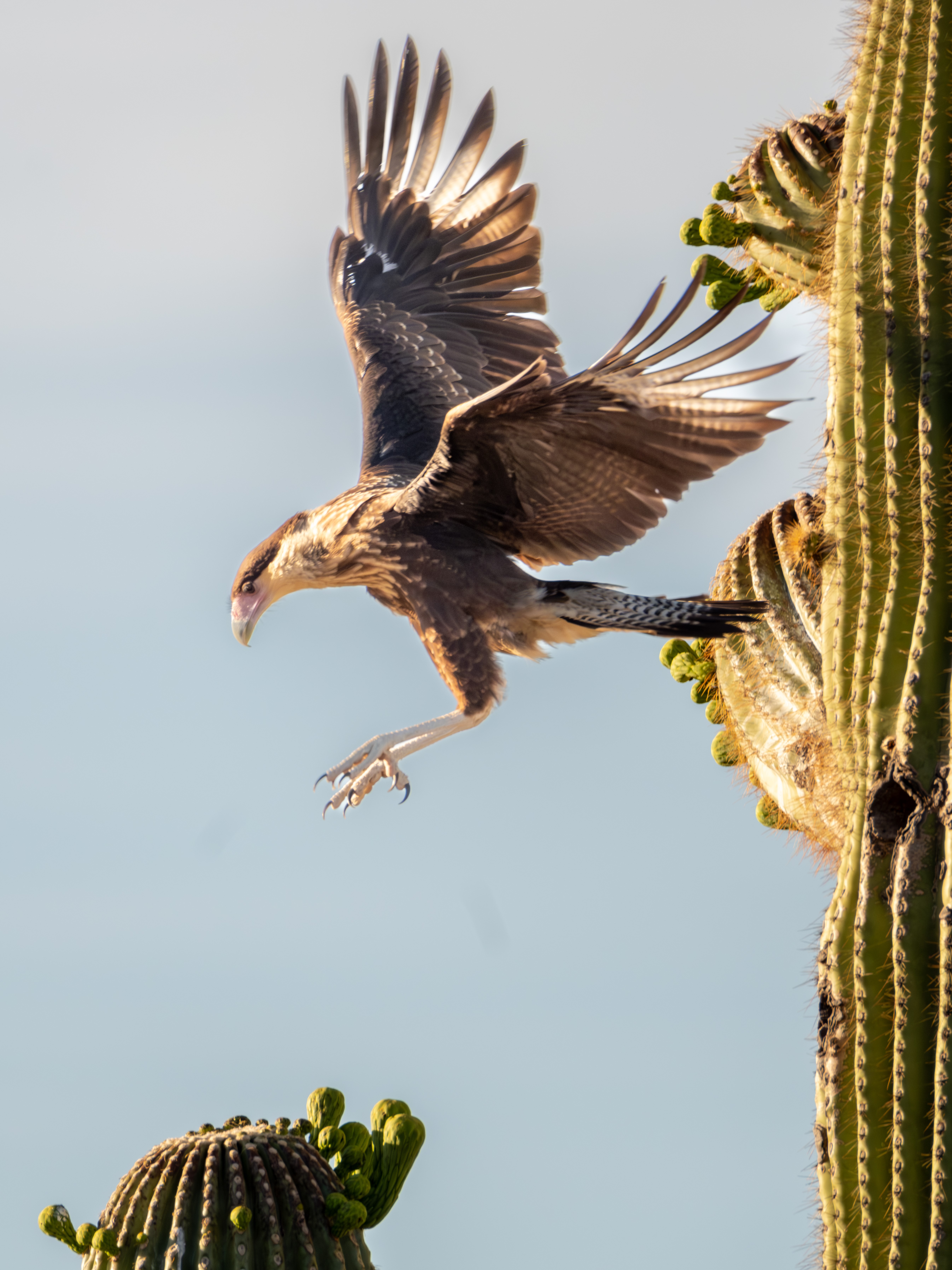 A male Northern Cardinal perches on sunlit desert wood, his red plumage glowing against the soft morning sky. A quiet moment in the Sonoran Desert, captured as he paused to survey his territory.
