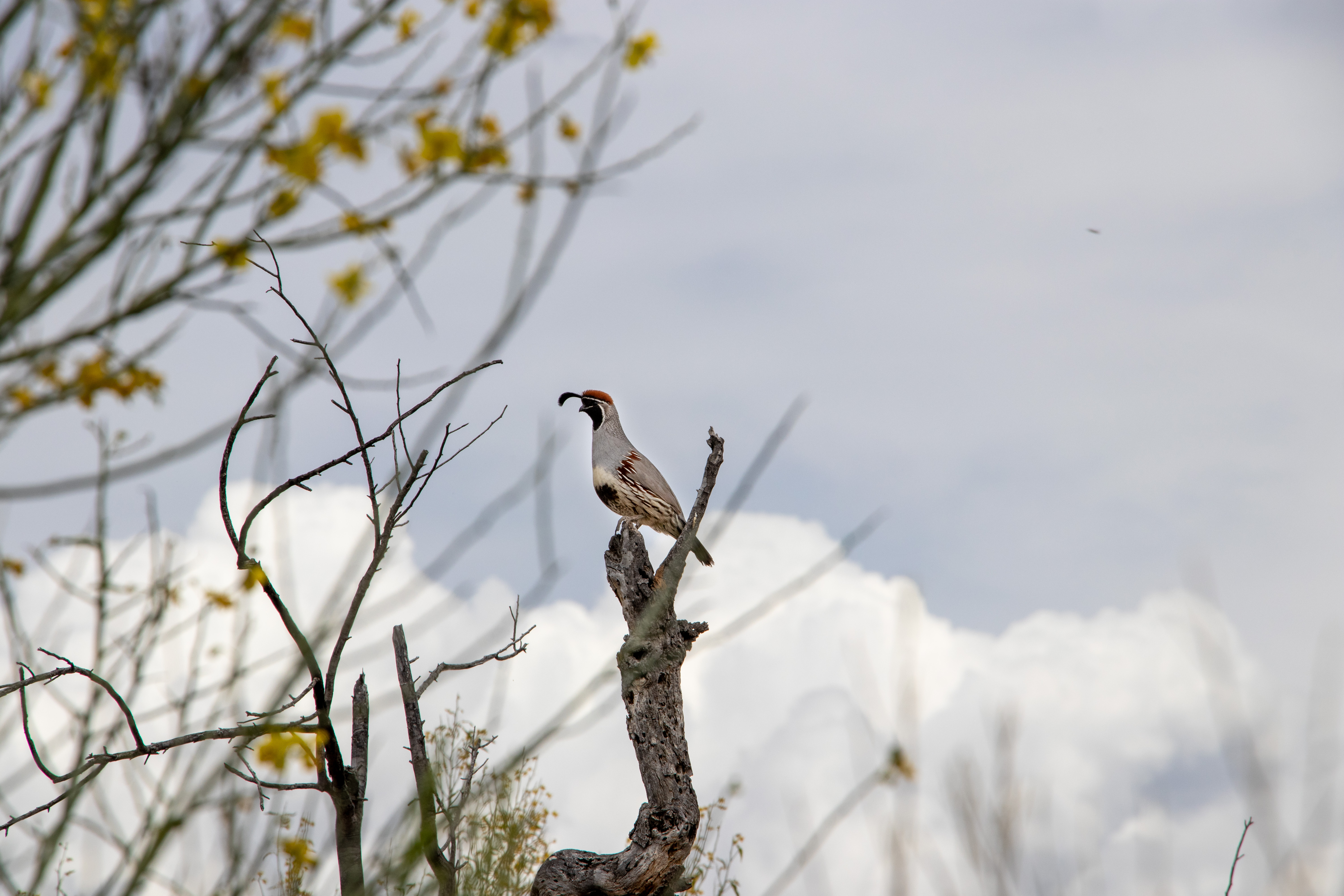 I captured this photo in midafternoon, when lighting in the shaded mid-story of the Madrean pine-oak woodland of the Huachuca mountains (one of Arizona's famous "Sky Islands) was soft and even without harsh shadows. Several species of hummingbirds were present, but I especially liked the composition that the branches this violet-crowned hummer perched on created, as well as the soft out-of-focus background, drawing your eye to the hummingbird.