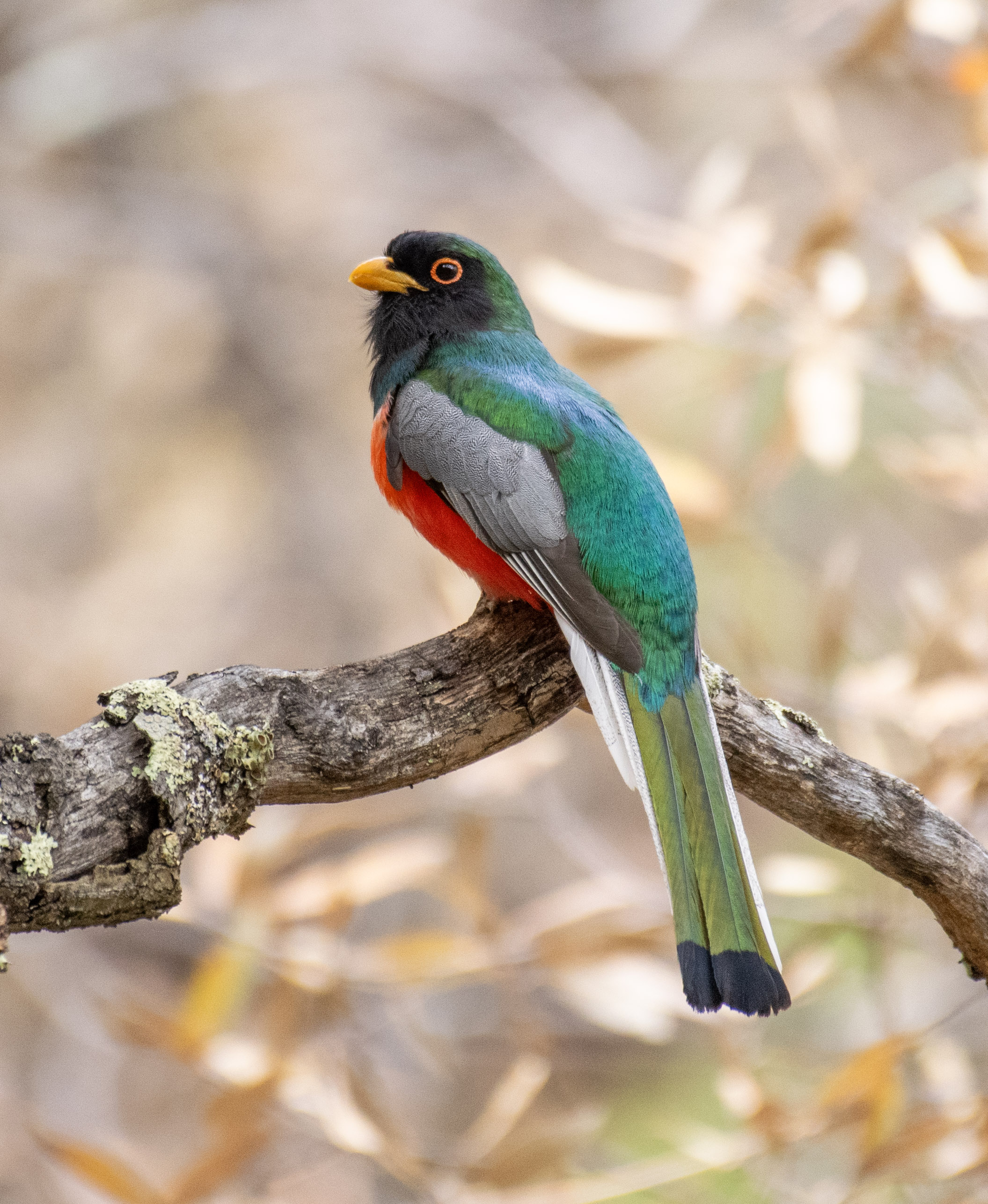 This species is definitely my favorite bird, and I have been fortunate to be able to see and photograph it multiple times. I like this photo because it shows the trogon's beautiful crimson breast, beautiful iridescent green back, and yellow bill and orange eye ring. The bird has its head tilted slightly, giving it a nice catchlight in the eye. Its perched on a moss covered branch with a background of out of focus orange leaves, giving an almost "fall colors" look to the seen.