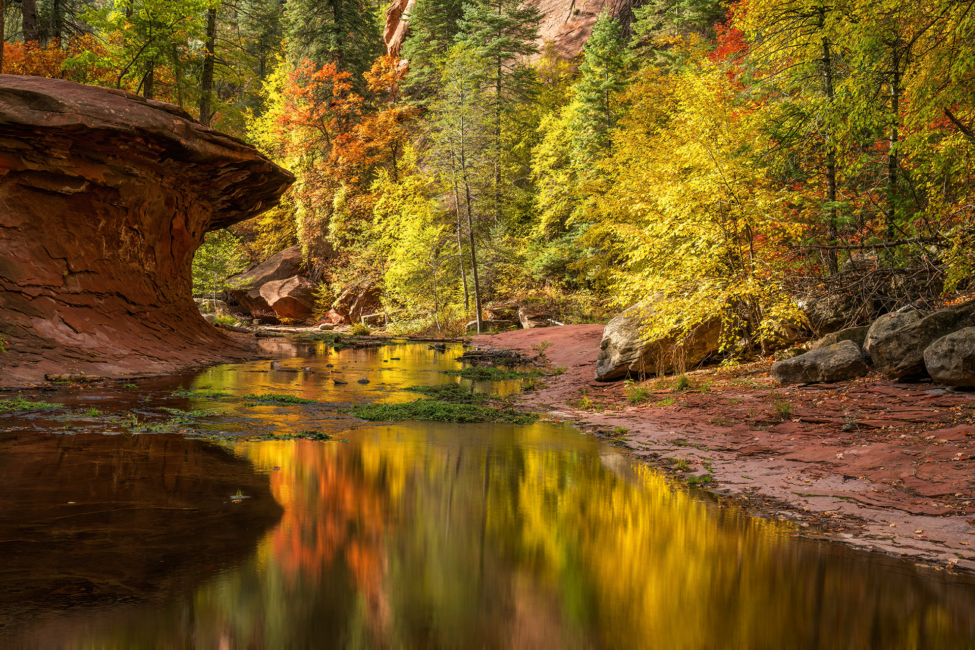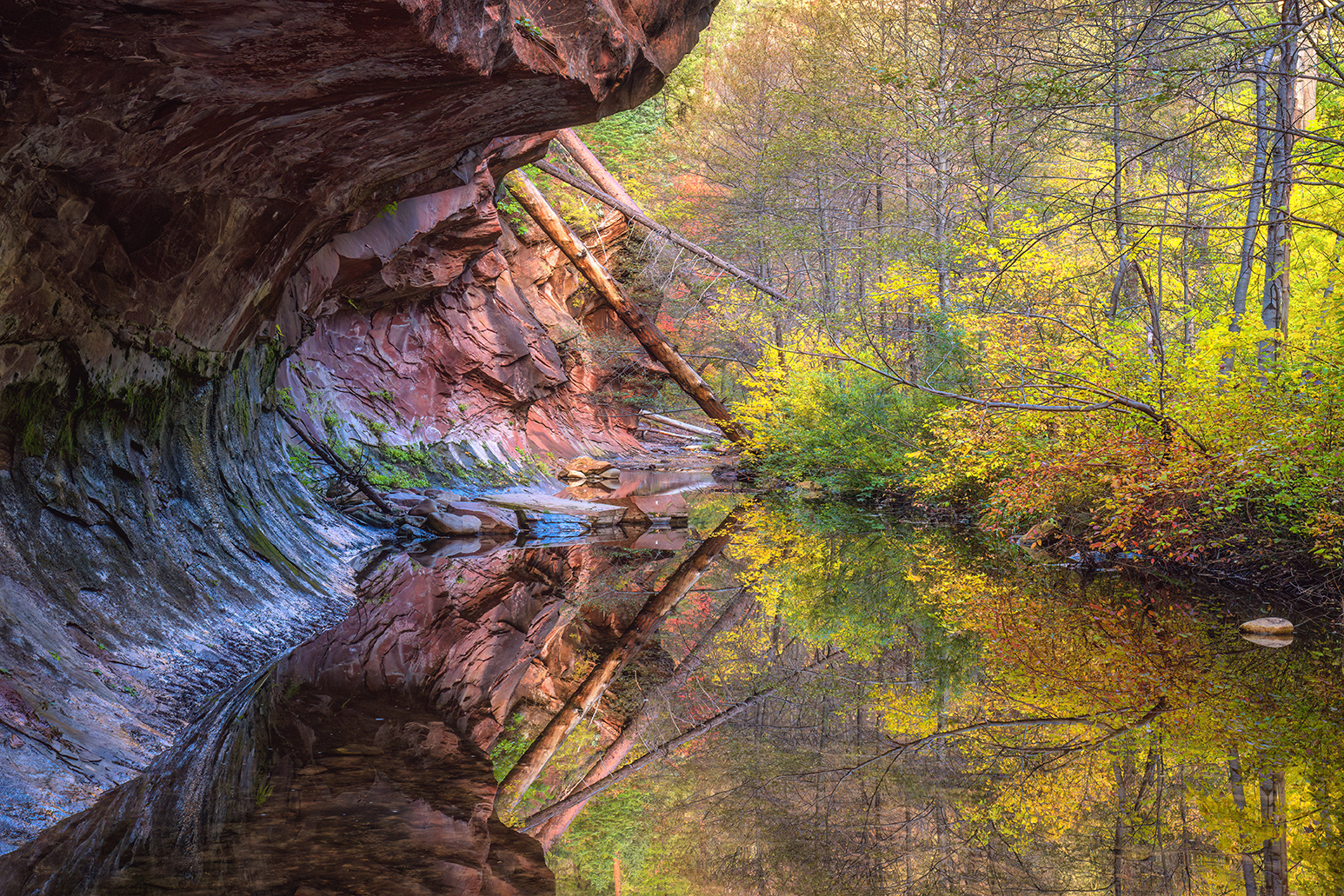 "Rorschach Reflections at West Fork:" Autumn colors and sculpted red rocks mirror themselves in the still waters of West Fork of Oak Creek.