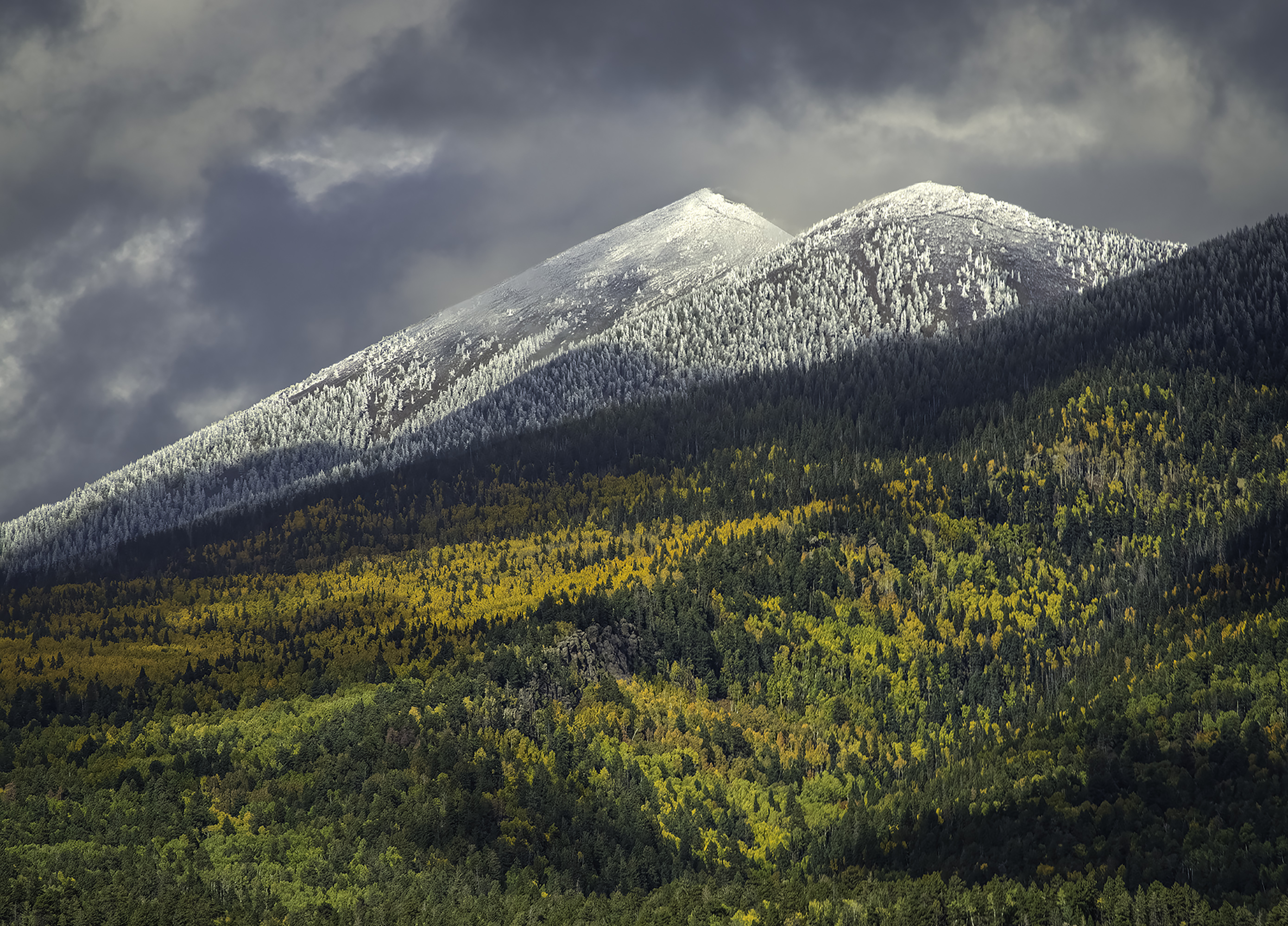 When the seasons collide between autumn and winter on the San Francisco Peaks, it creates a wonderful juxtaposition lasting for only a brief few seconds before the clouds shrouded the mountain again.