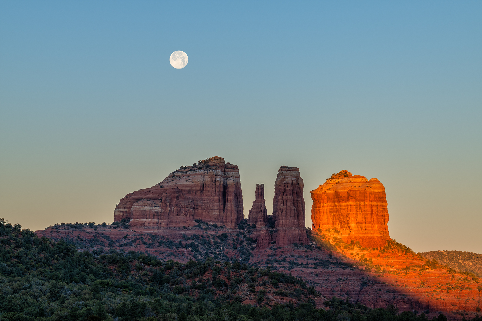 "Breaking Dawn at Cathedral Rock:" As the full moon sets and the sun rises, Cathedral Rock becomes a canvas of shadow and light, reflecting the harmony and duality of night and day.