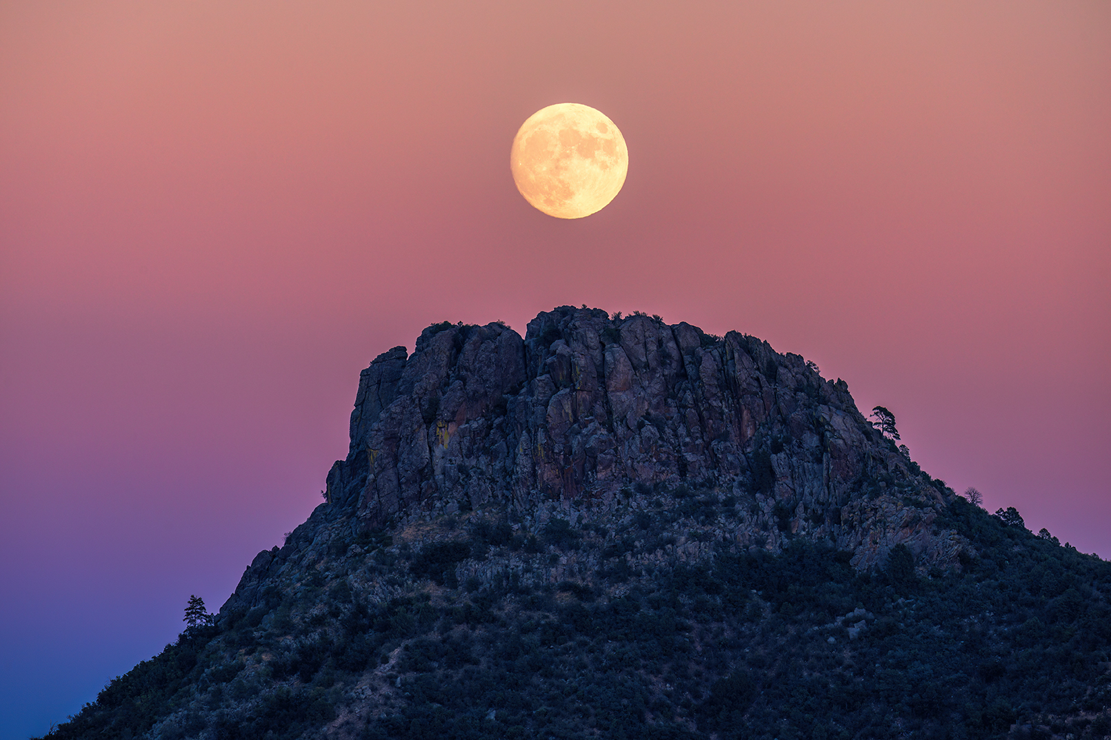 "Pastel Moonrise Over Thumb Butte:" The full moon rises above Thumb Butte as the Belt of Venus colors the dusky sky in rosy pastel hues.