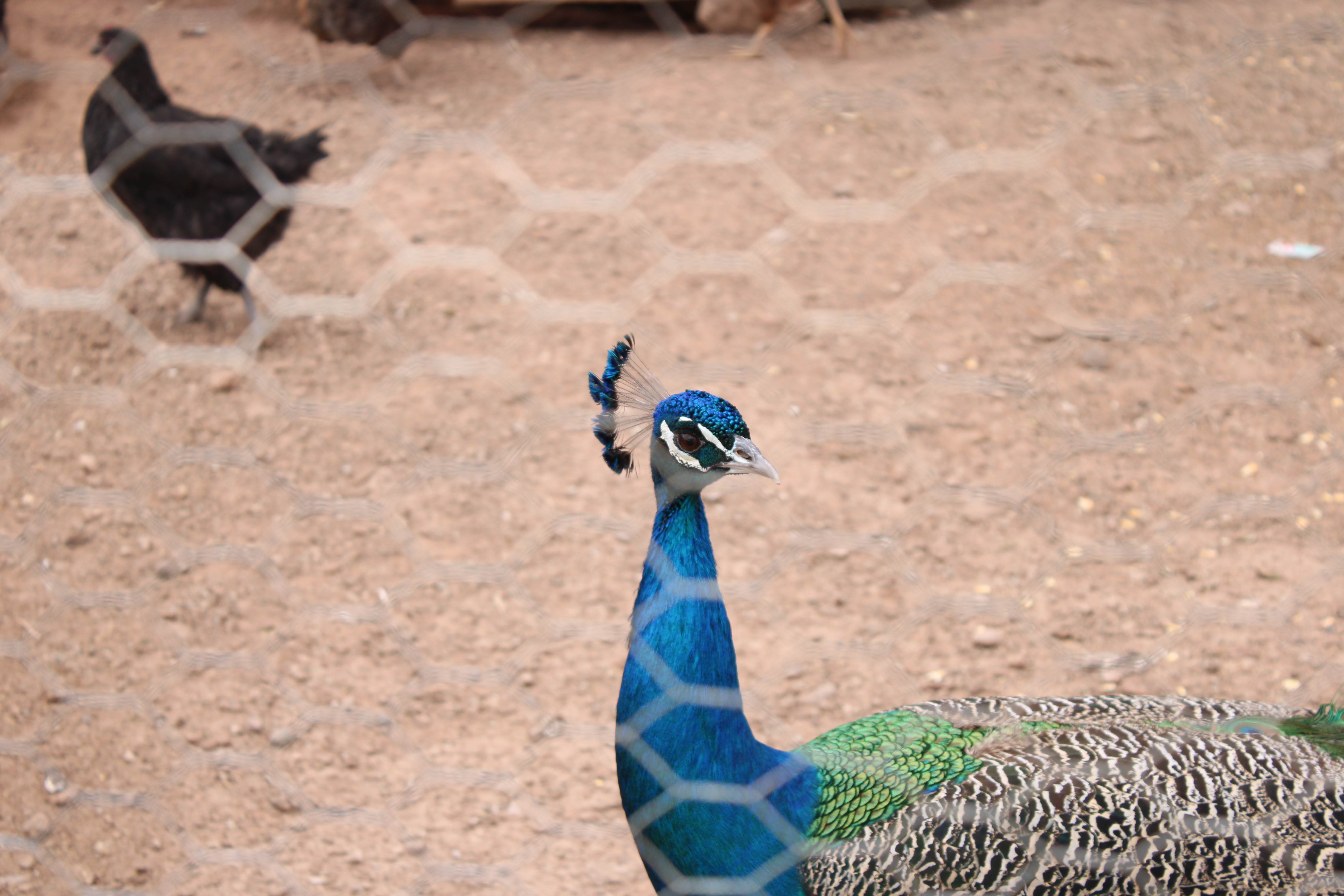 the peacock is looking at the camera through the gate
