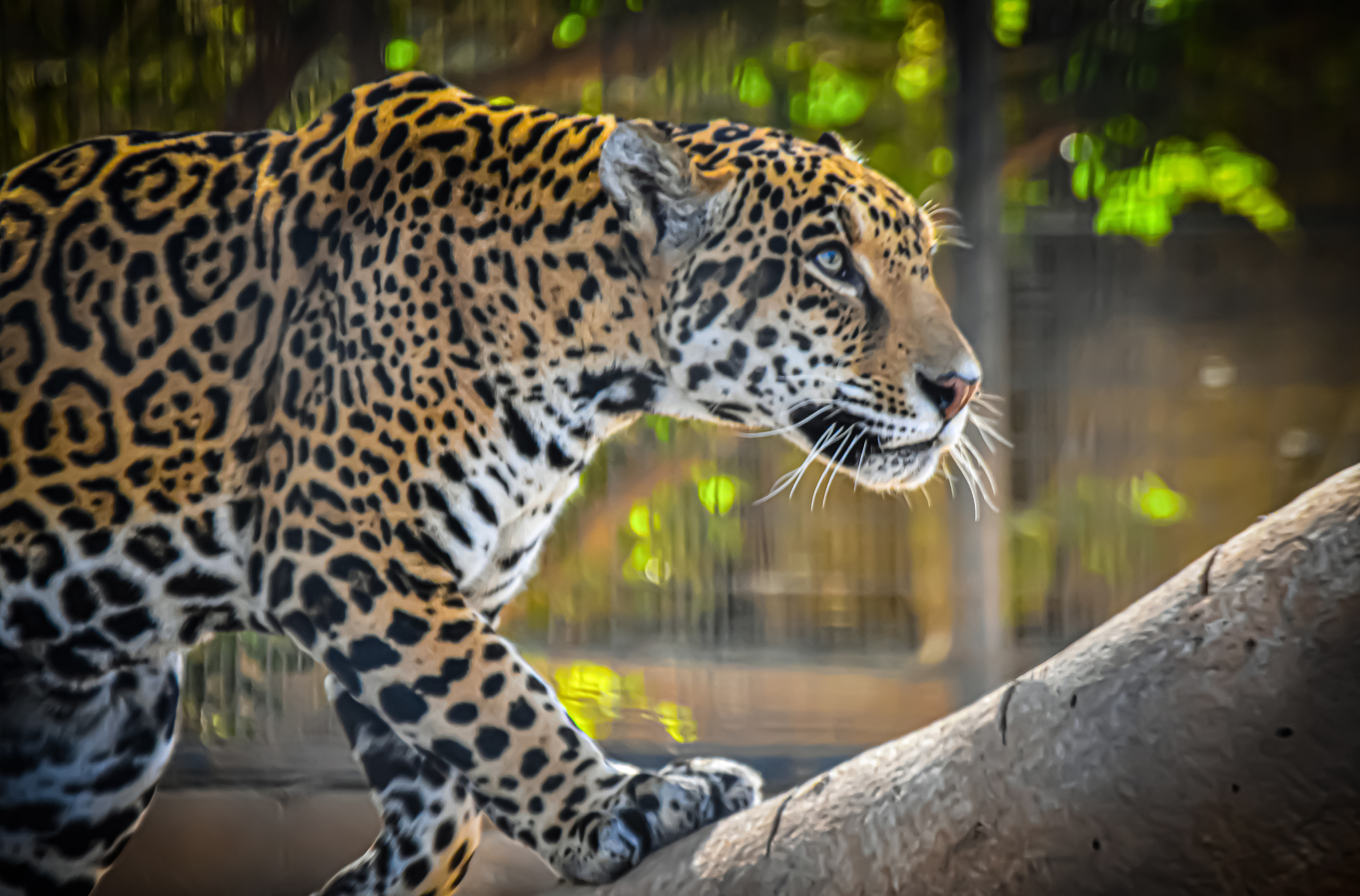 A leopard walking up a log