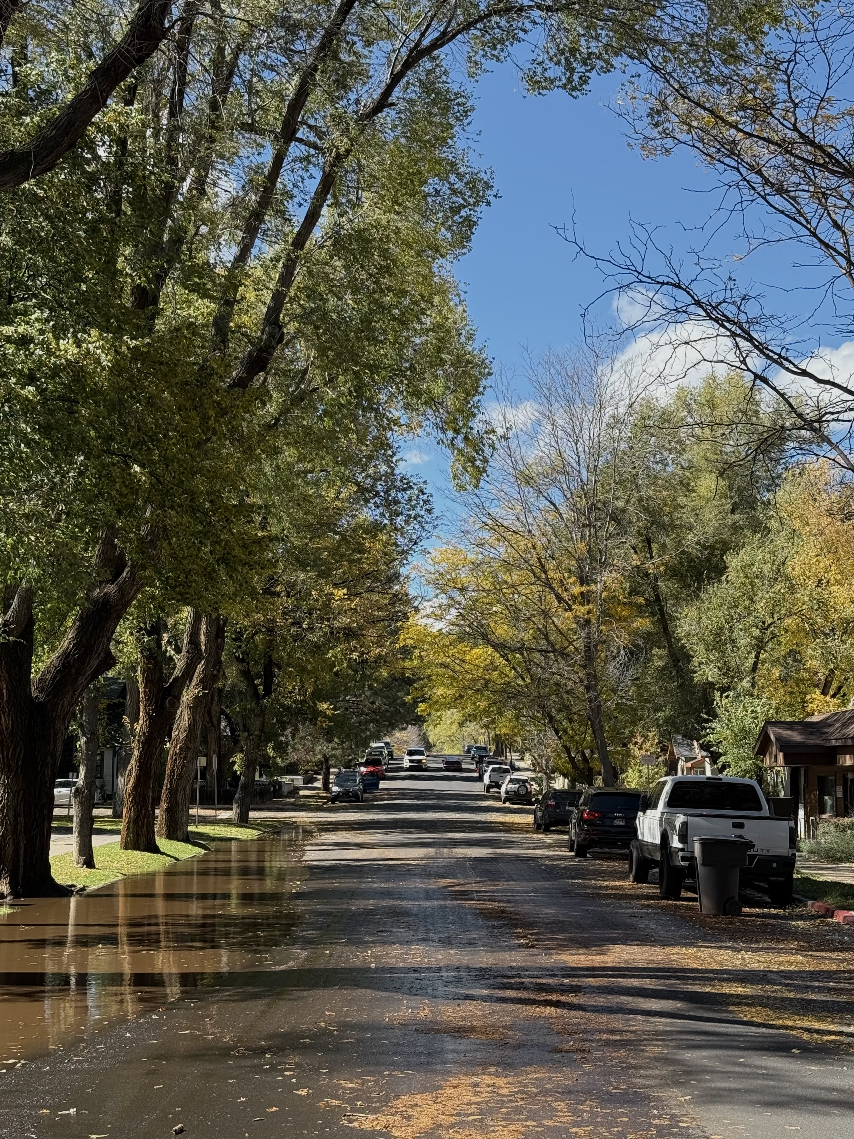 A quiet, tree-lined neighborhood street with autumn leaves scattered across wet pavement, reflecting sunlight under a bright blue sky.