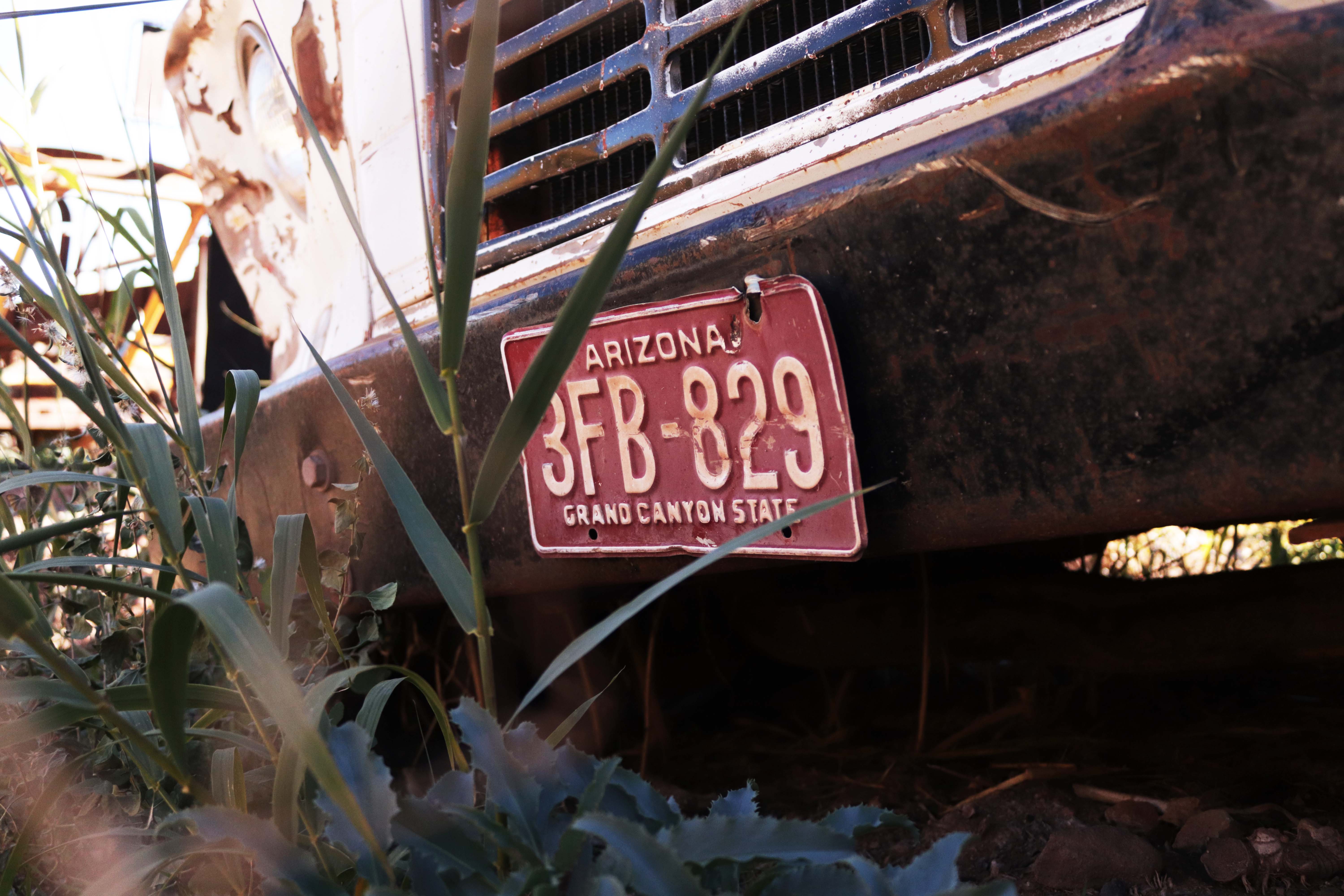 The license plate of an old, broken-down, rustic truck in a field on the outskirts of the peaceful mining town.