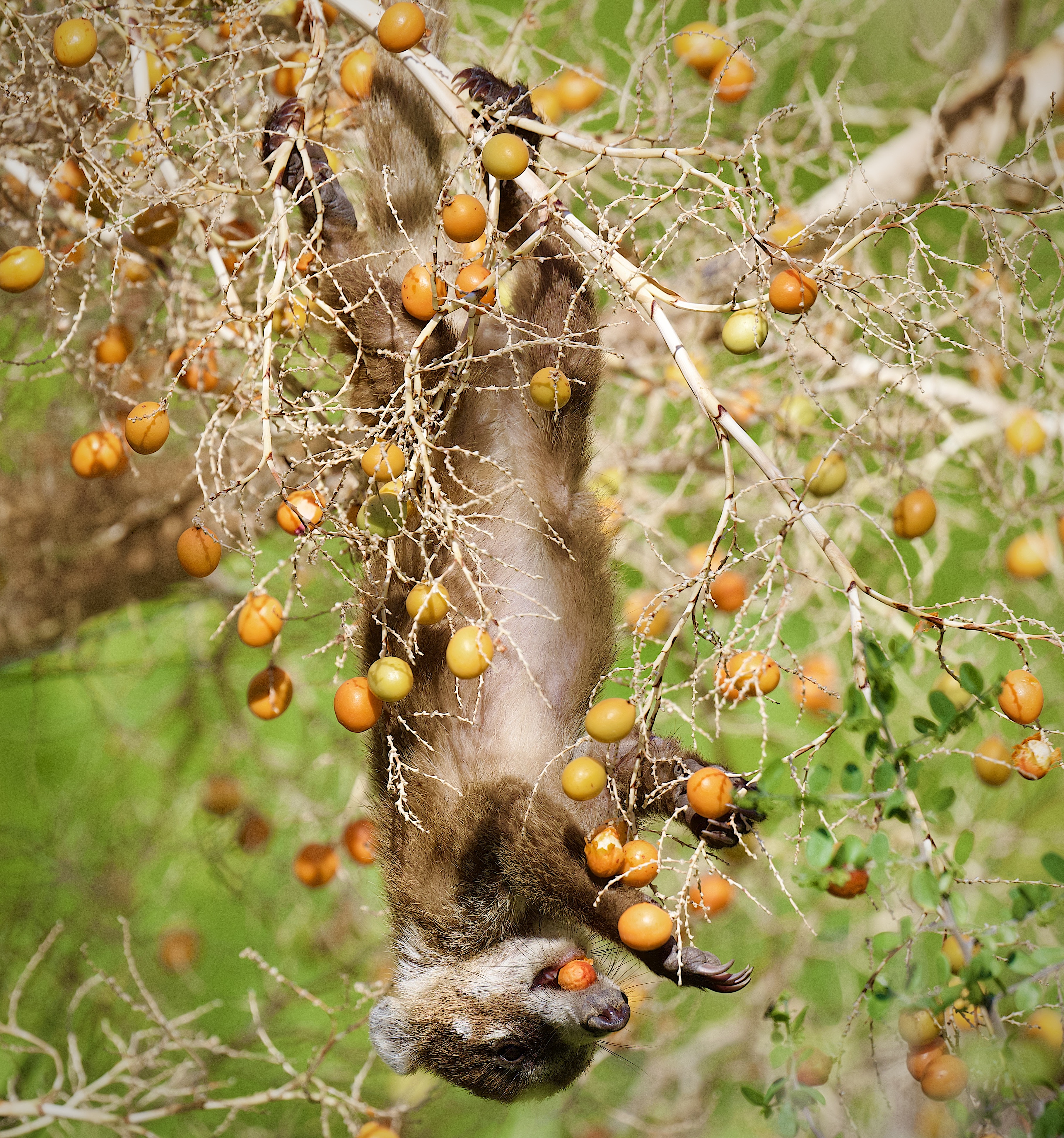 A Baby Coatimundi displays it's agility by picking and eating Pindo Palm fruit completely upside down !