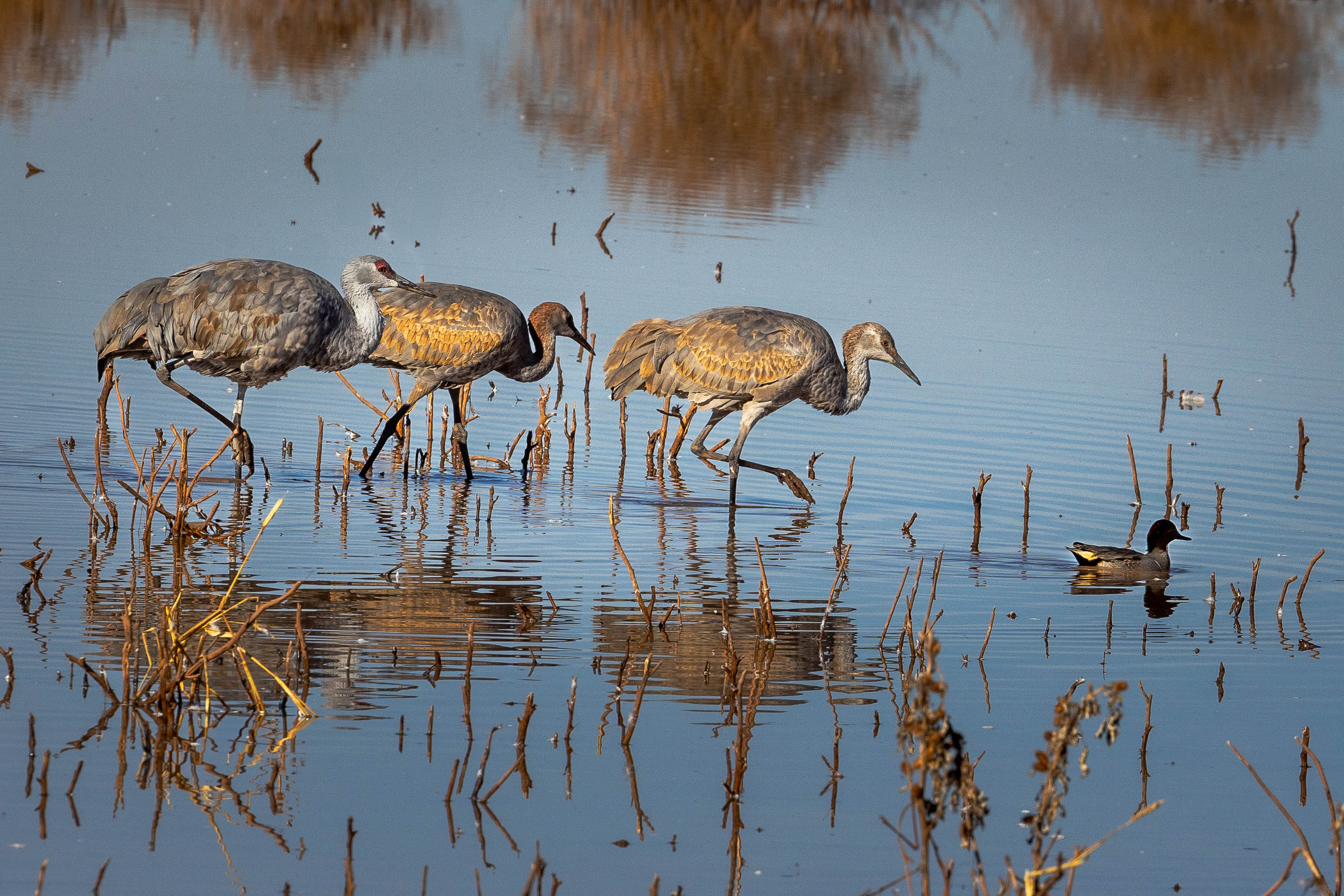 Follow my lead! Sandhill cranes following a confident duck at Whitewater Draw Wildlife area.