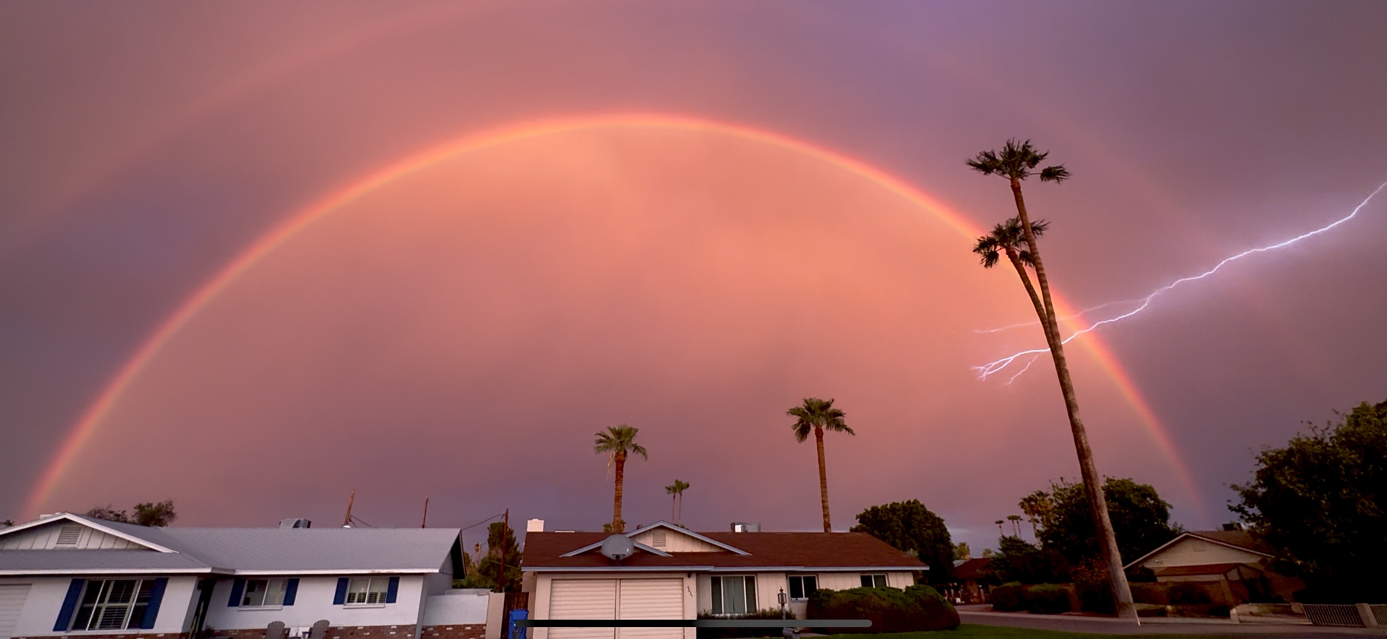 Arizona Monsoon storm with complete double rainbow and lightning strike