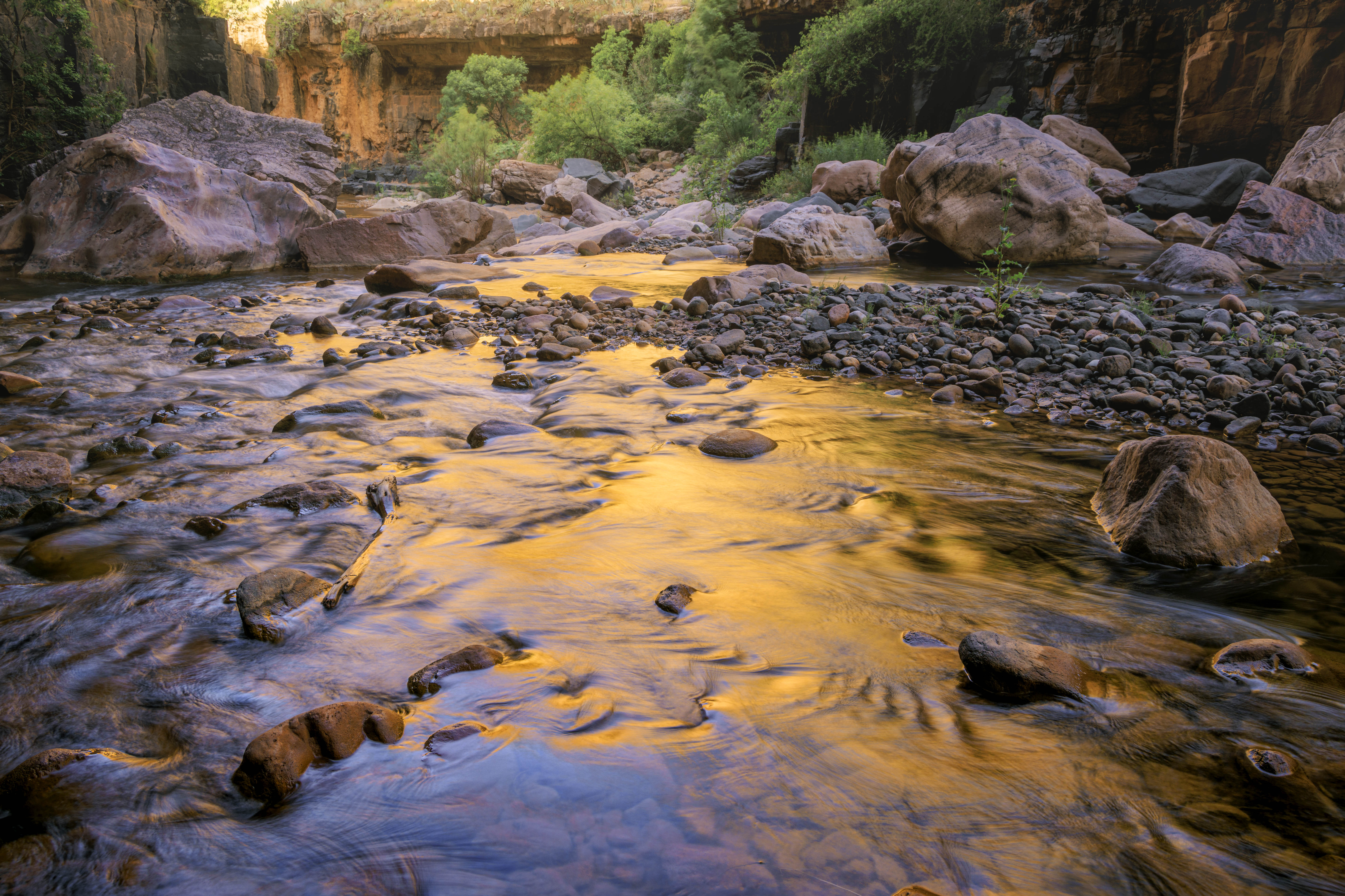 Golden reflected light shines on the ice and water of the west fork of oak creek