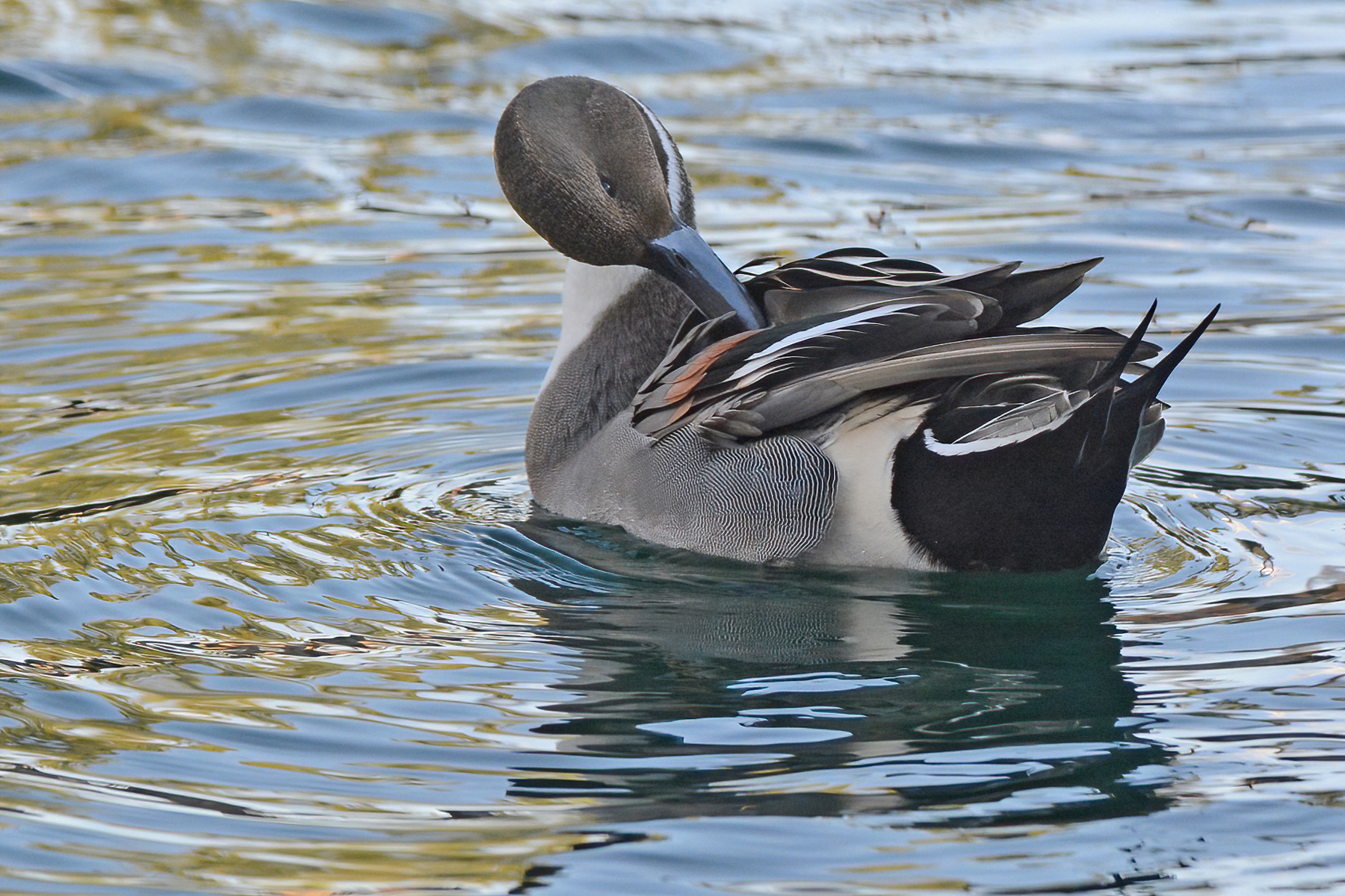 A wintering Northern Pintail drake grooms himself in a Phoenix pond.