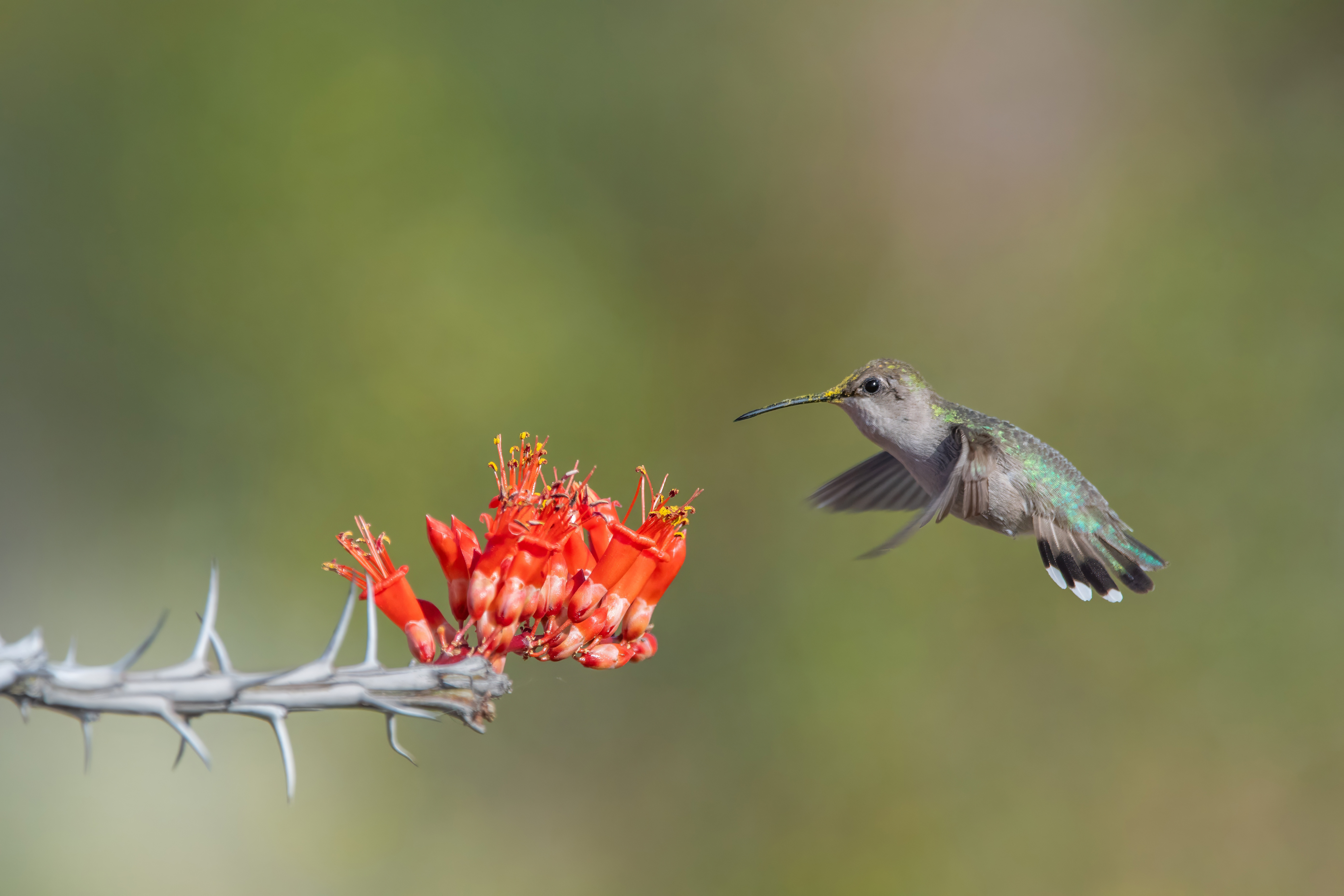 A female hummingbird enjoys a quick morning visit to a stunning Ocotillo bloom