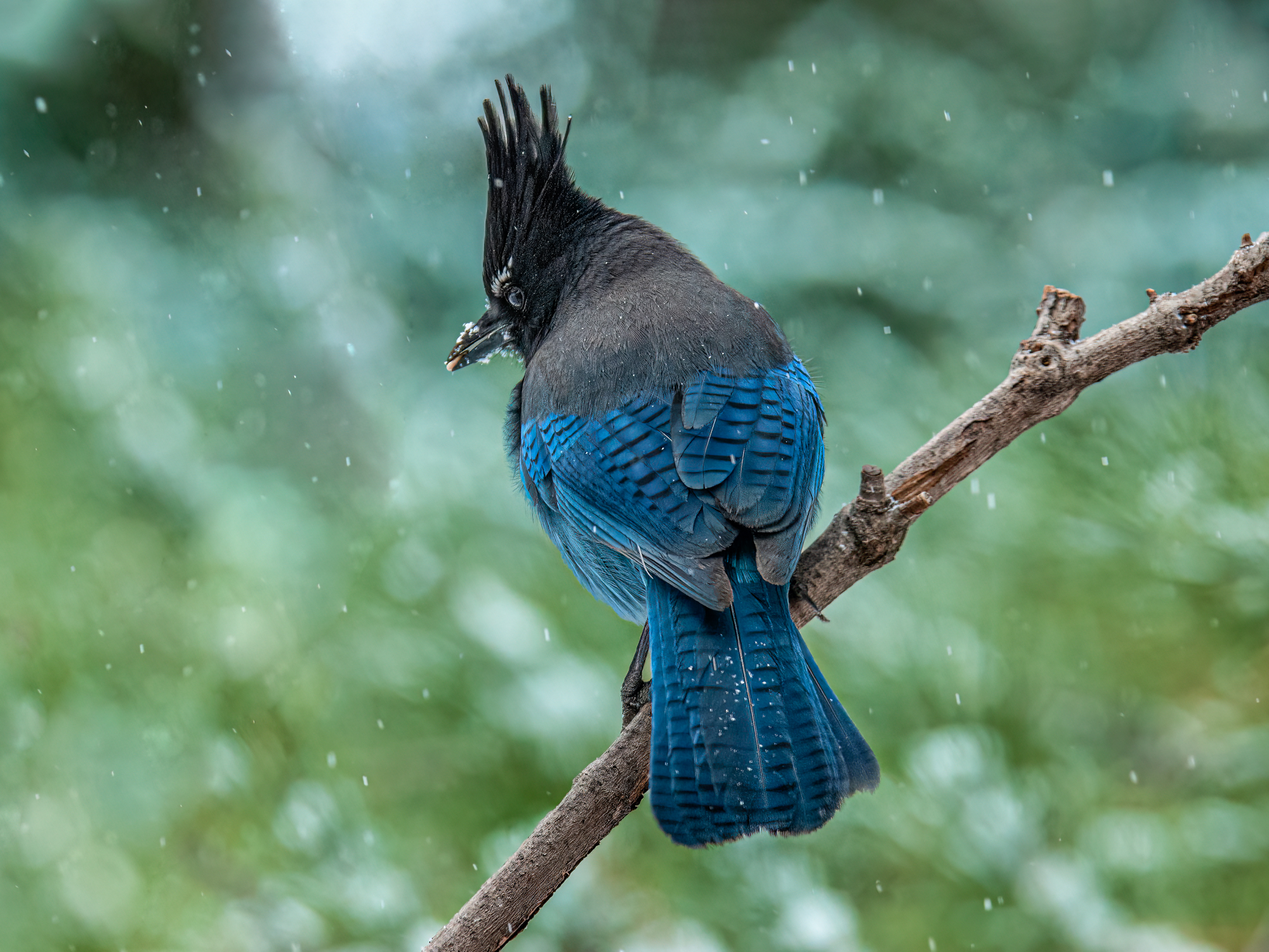 A Steller’s jay perches in a snowstorm at Walnut Canyon Lakes in Flagstaff, Arizona, its dark plumage standing out against the winter forest.