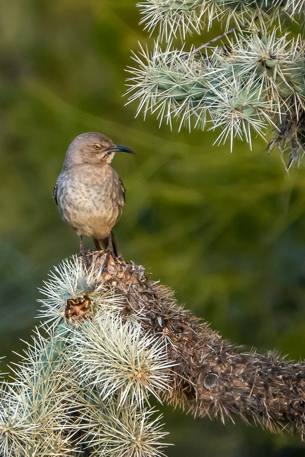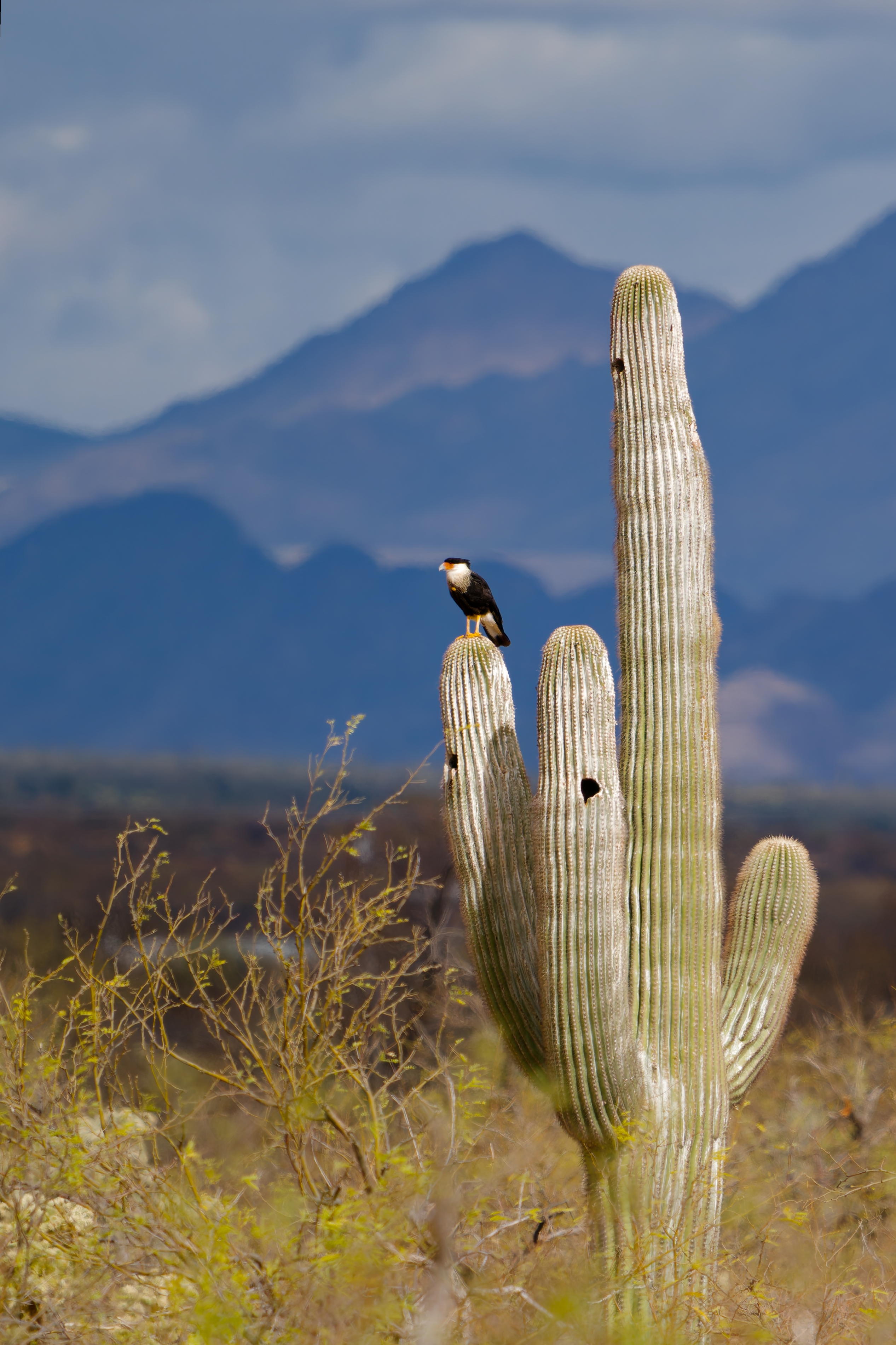 Majestic setting: morning light highlights the Crested Caracara perched on a saguaro with the Roskruge Mountains in the background.