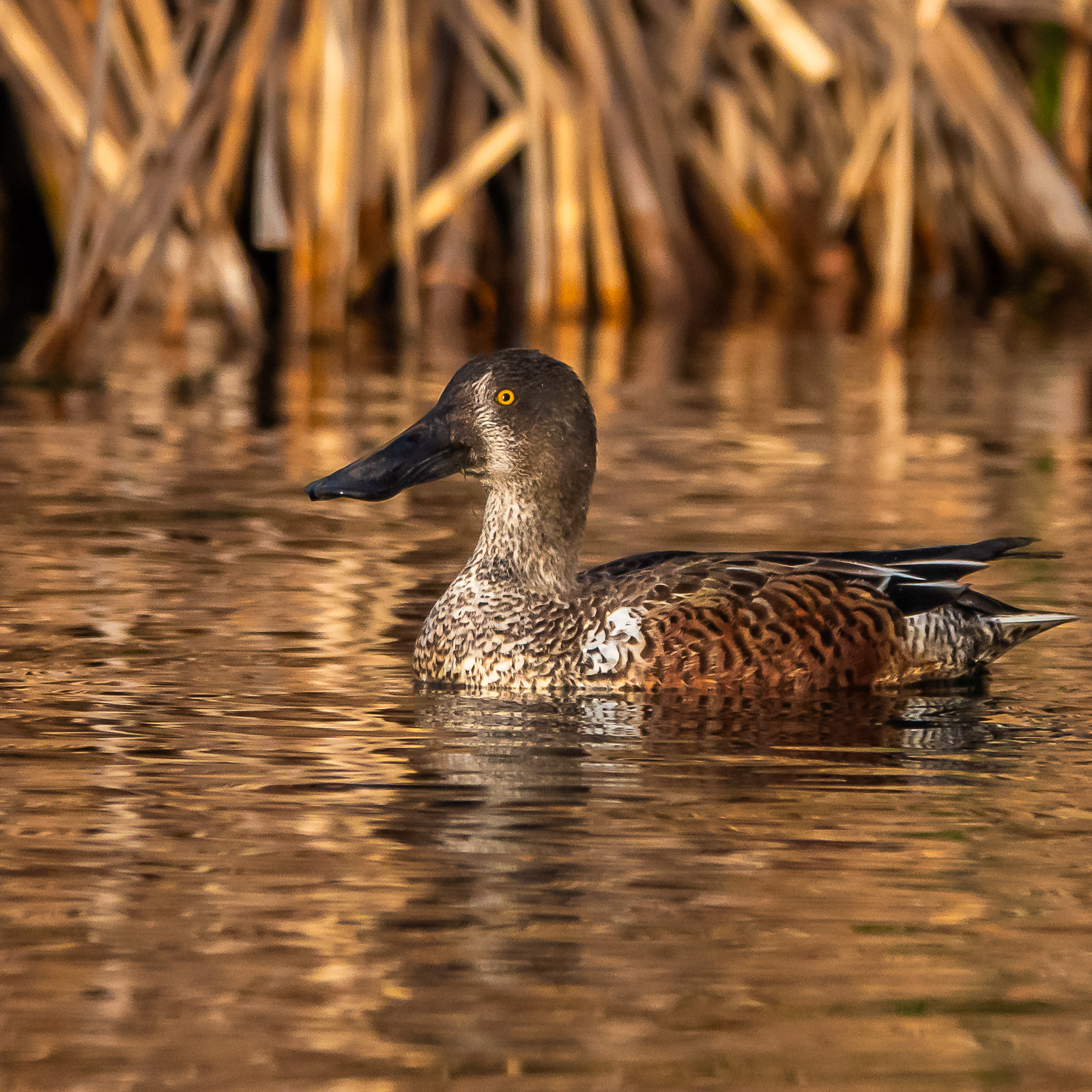 This Northern Shoveler blended beautifully with the golden sunrise and its surroundings.
