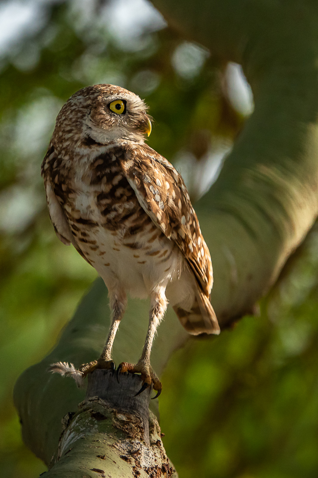 This burrowing owl rest on a branch with faint traces of its latest catch still on its talons.