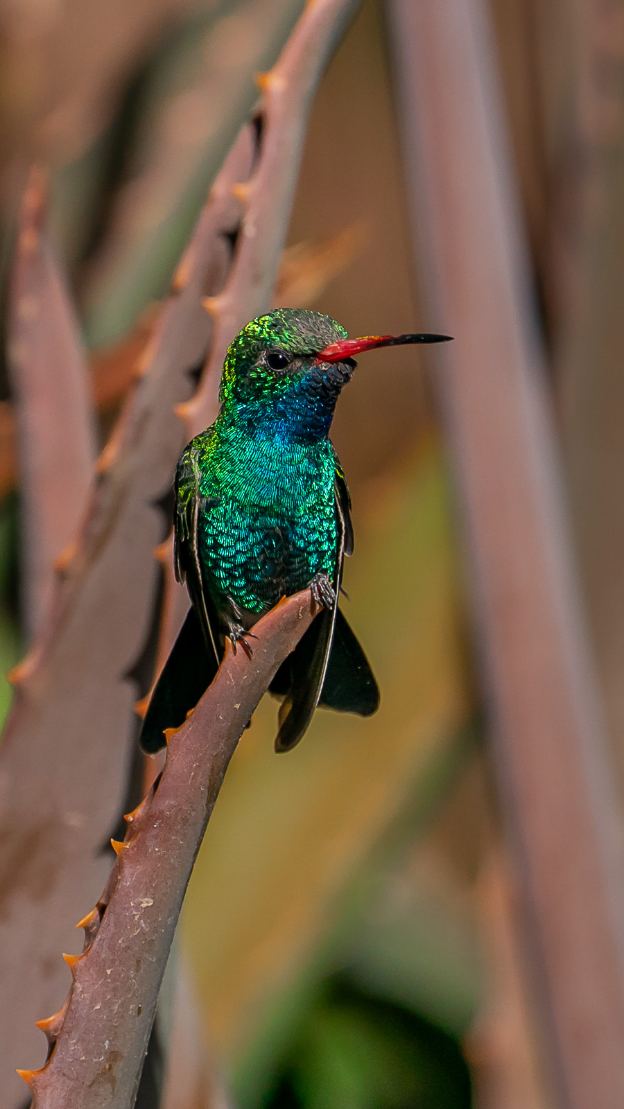 A Broad-billed hummingbird showing of his iridescent feathers.