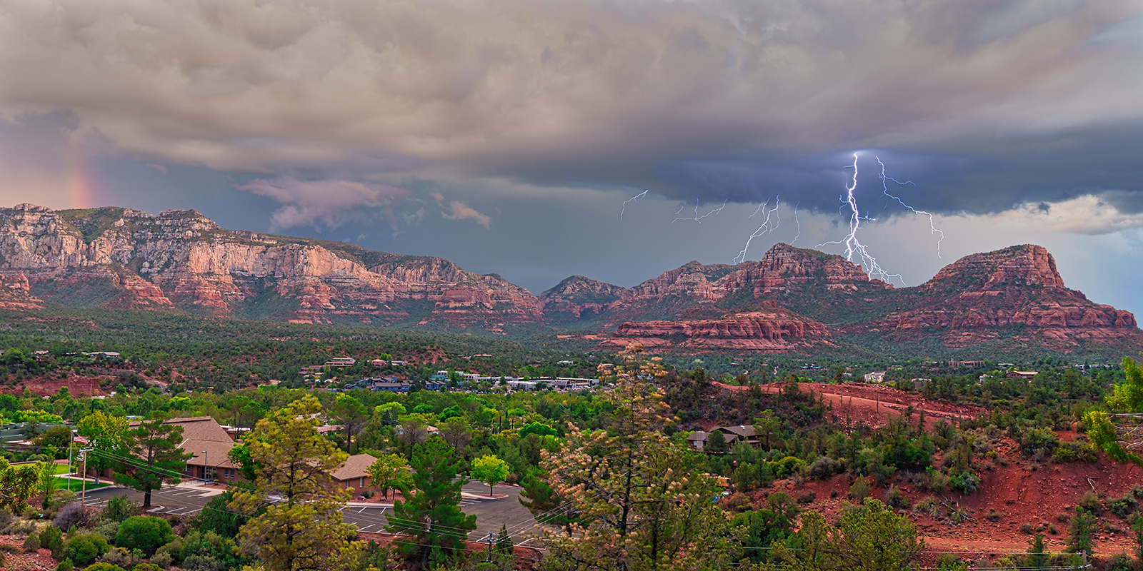 A monsoon storm unleashes a lightning strike over Apache Maid Mountain while a rain shaft drenches the neighboring pinyon-juniper woodlands.