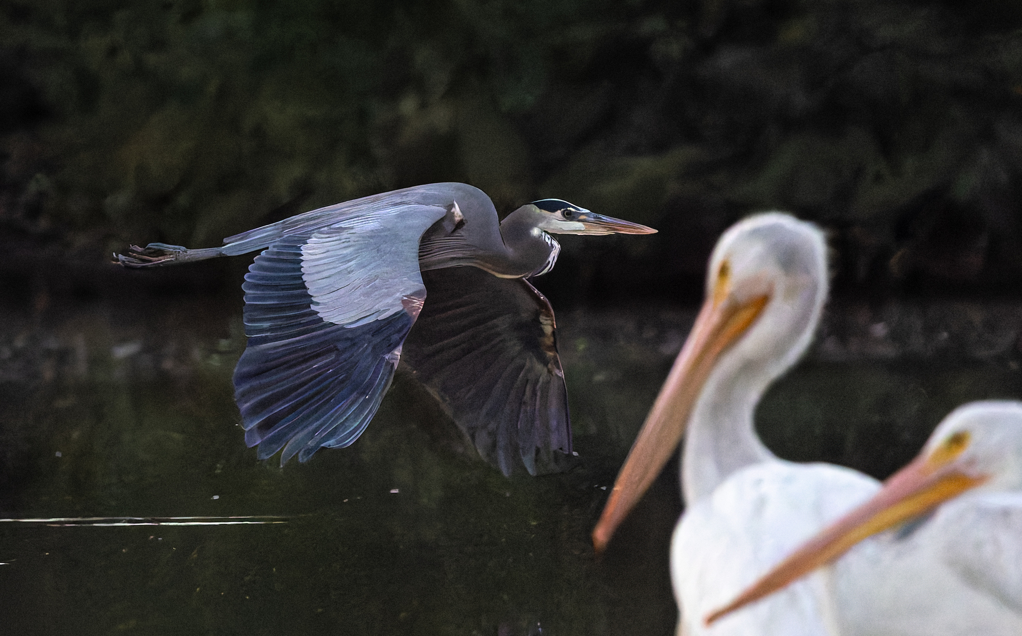 A Great blue heron flies by of a pair of American white pelicans.