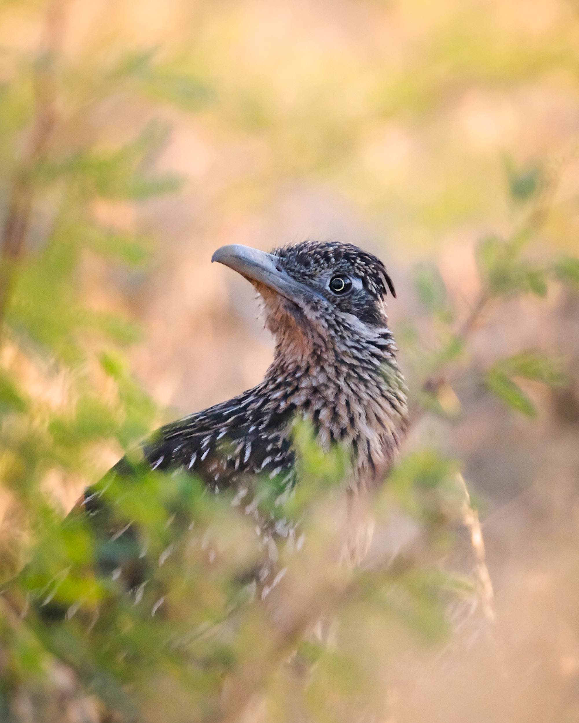 A portrait of a roadrunner taken on a summer evening in the mojave desert.