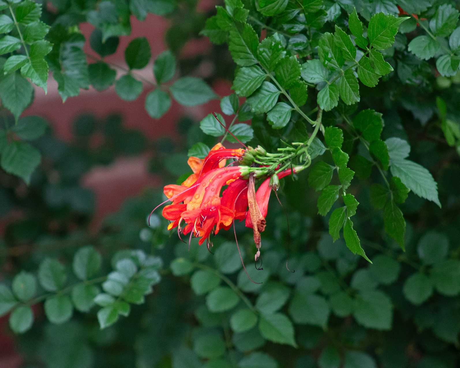 photo taken after a rainy day in Tucson, this bright flower contrasts with fresh green leaves and fresh droplets, capturing a rare refreshed side of the desert.