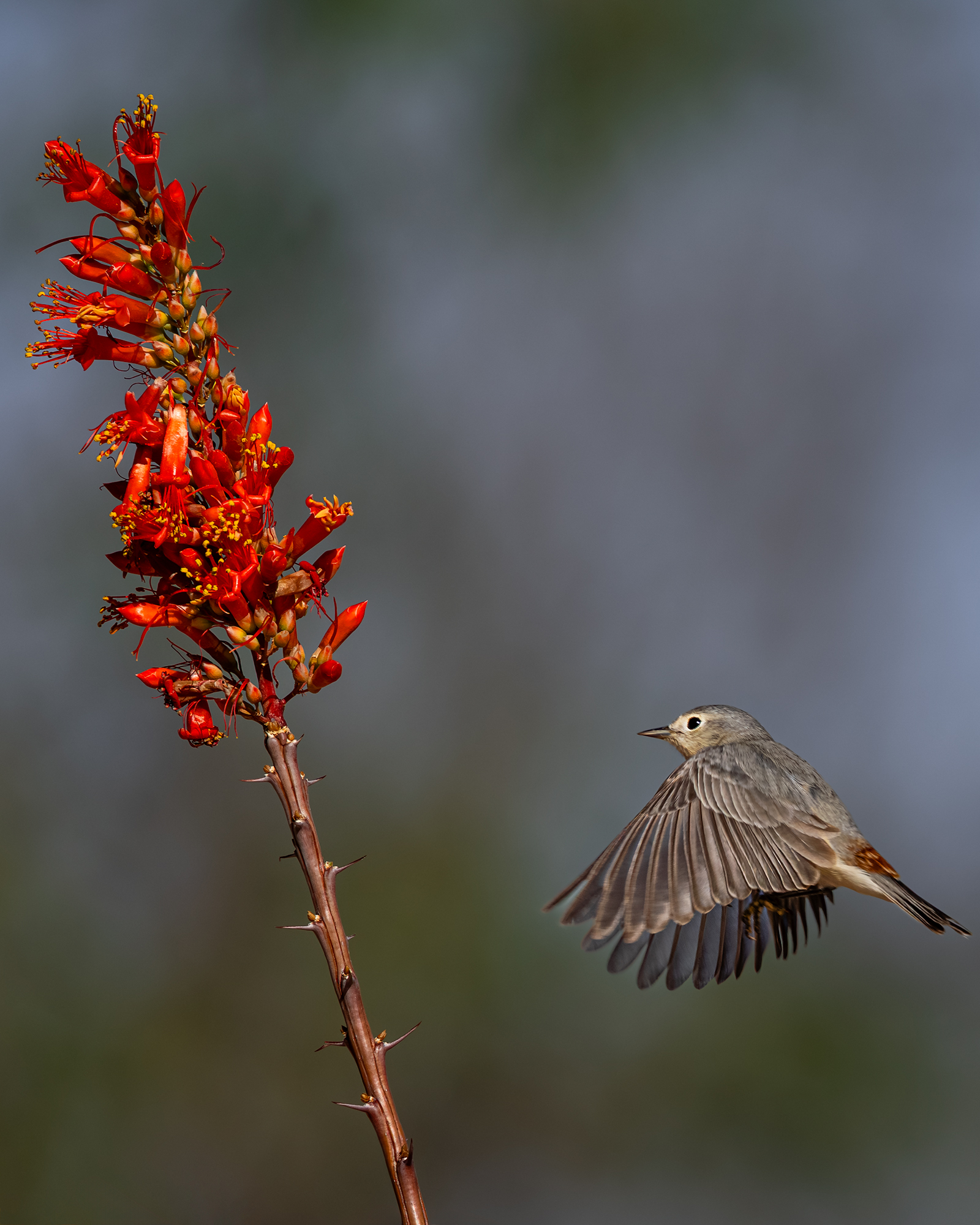 A Lucy’s Warbler lifts into the calm of a late-sunrise sky, pausing beside the vibrant ocotillo blooms that mark spring in the Sonoran Desert.