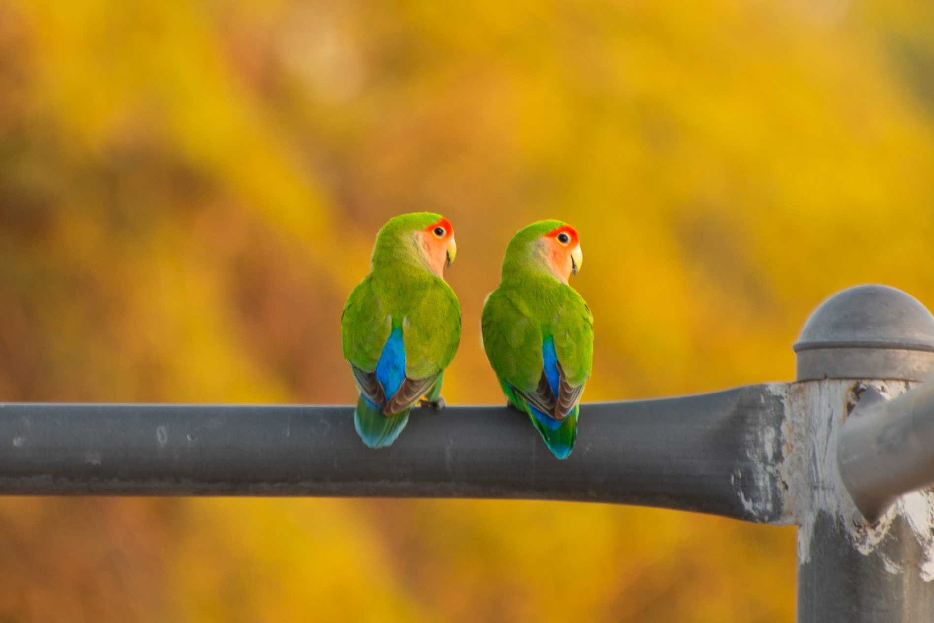 Date night at the corral: Rosy-faced lovebirds share a synchronous moment on a fence in Cave Creek, Arizona.