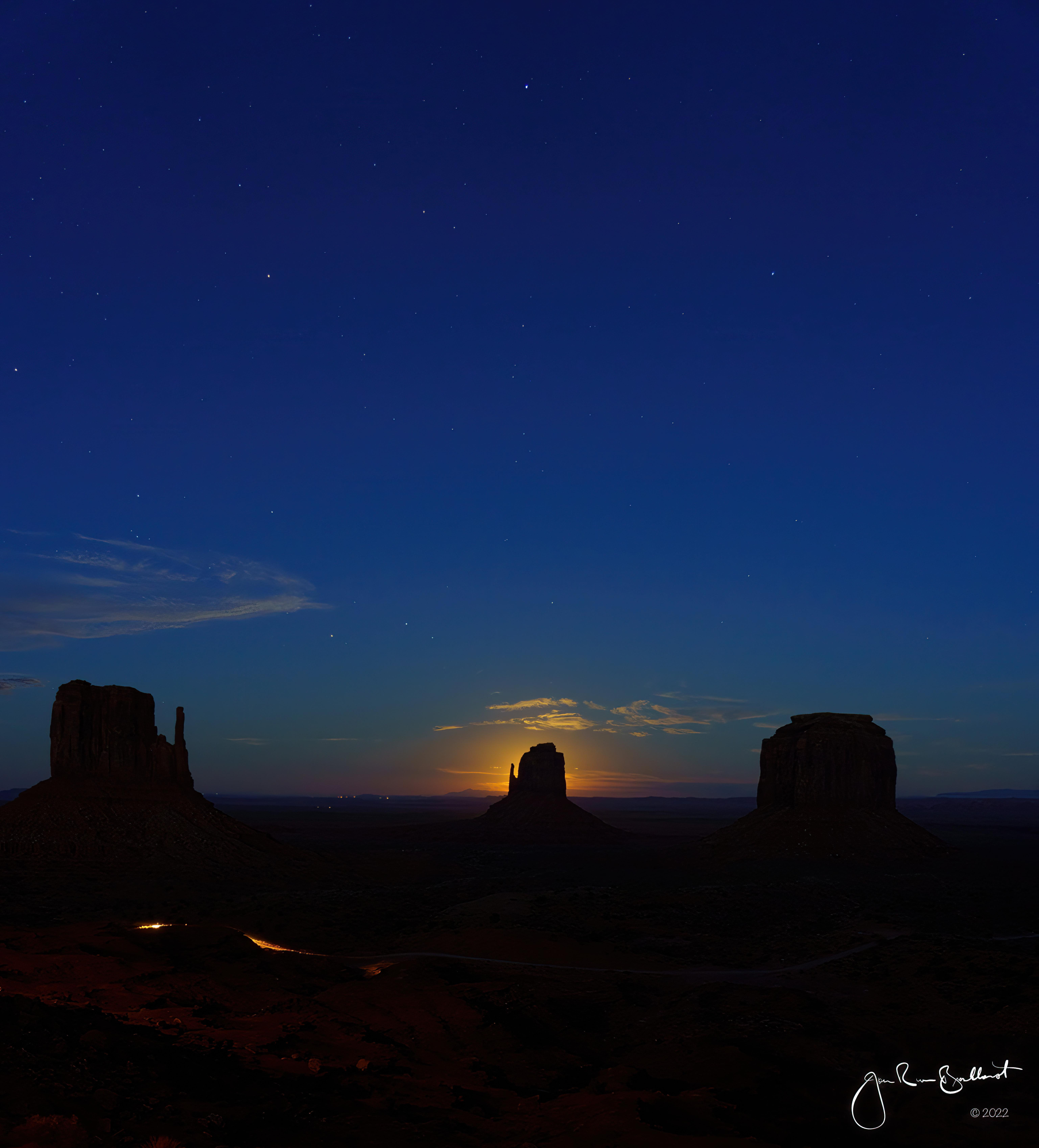 Moonrise behind the south mitten in Monument Valley. The intense glow of the full moon makes this look more like a sunrise. Shot from The View Hotel. Taken October 10, 2022