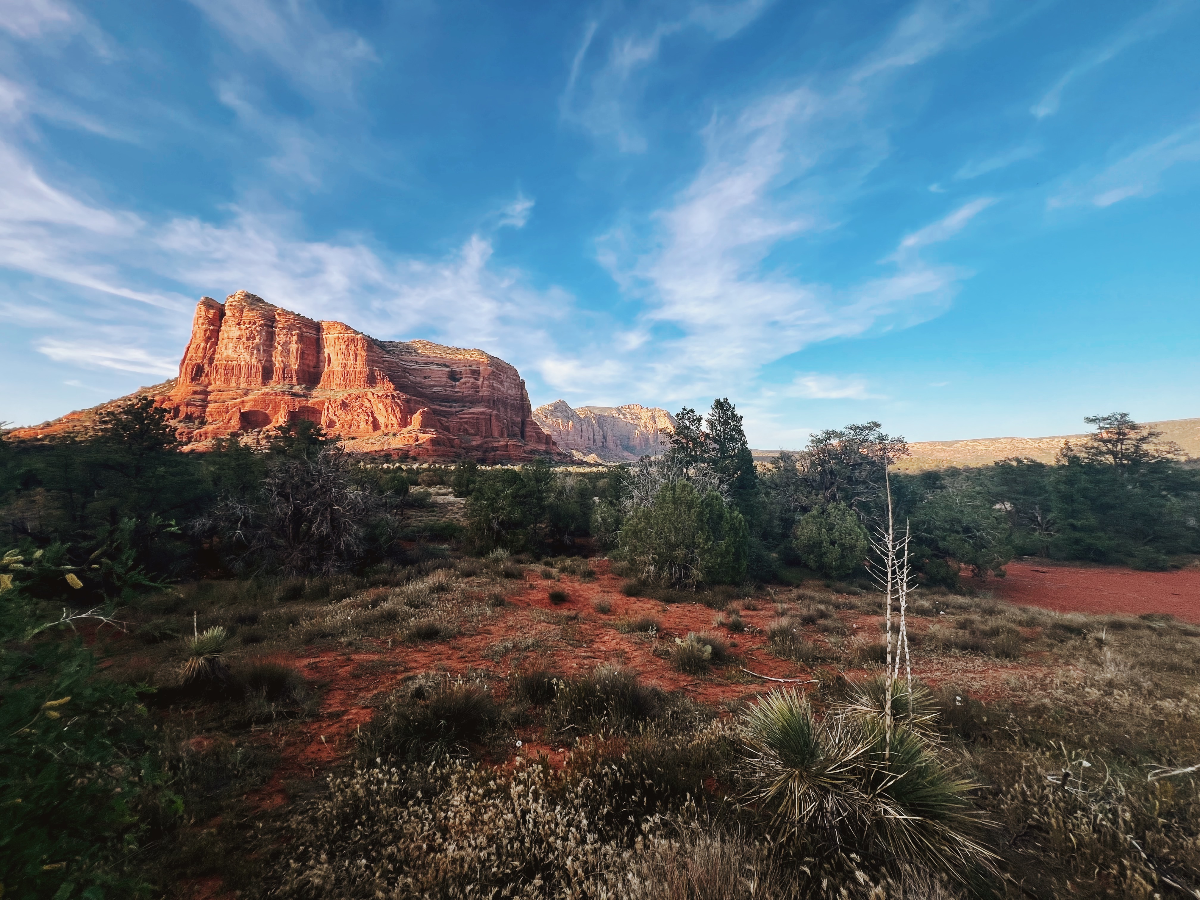 A wide view of Sedona’s red rocks glowing in late-day light. The cliffs rise behind a mix of dry grasses and juniper trees, set under a deep blue sky brushed with soft clouds.