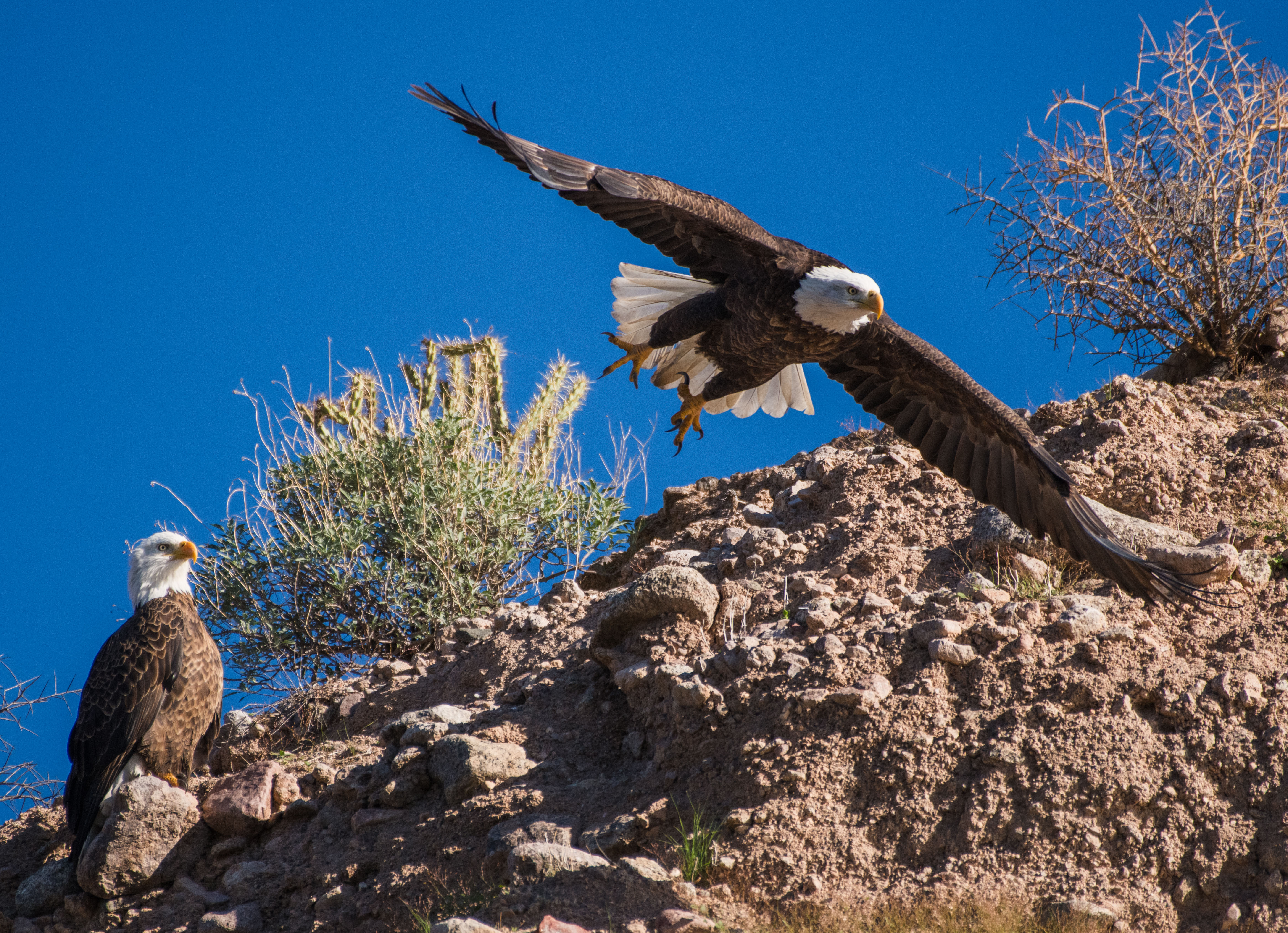 One commands the skies, the other commands the mountain—two eagles claiming the desert as their kingdom.
