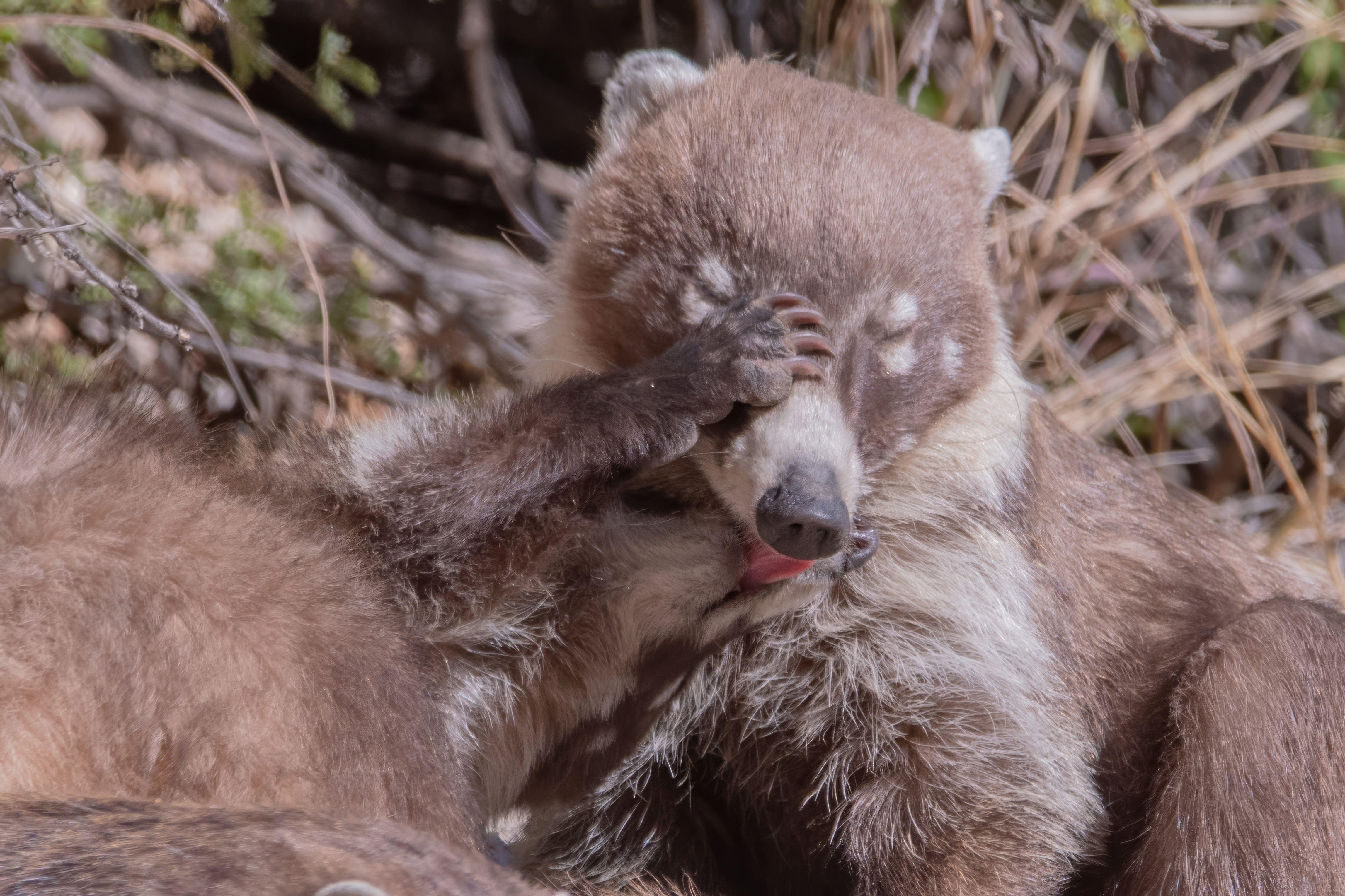 A sweet moment between a juvenile and adult white-nosed coati, with the youngster grooming the tail of the resting adult