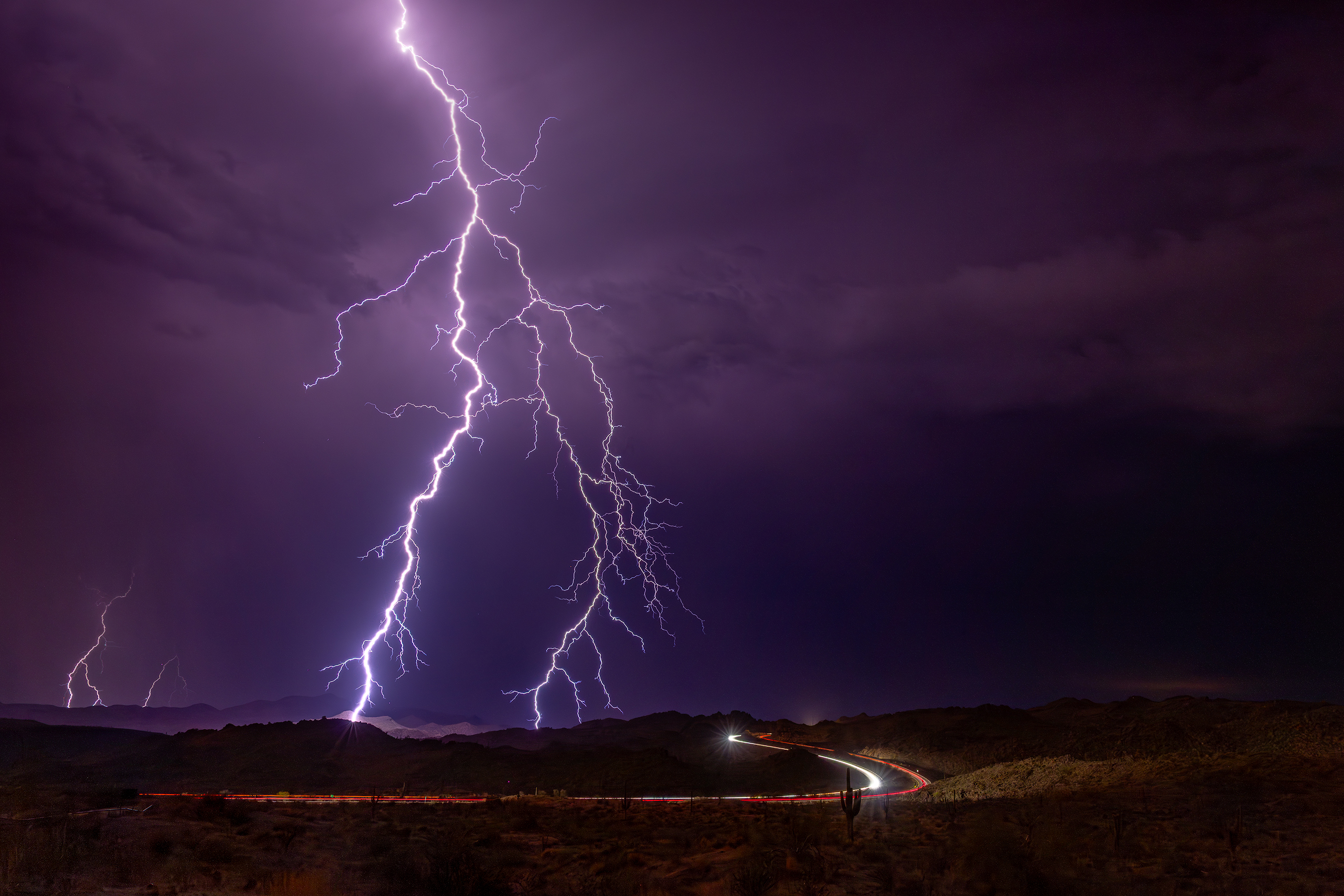 A massive bolt of lightning strikes down as cars travel the winding SR87 near Four Peaks.