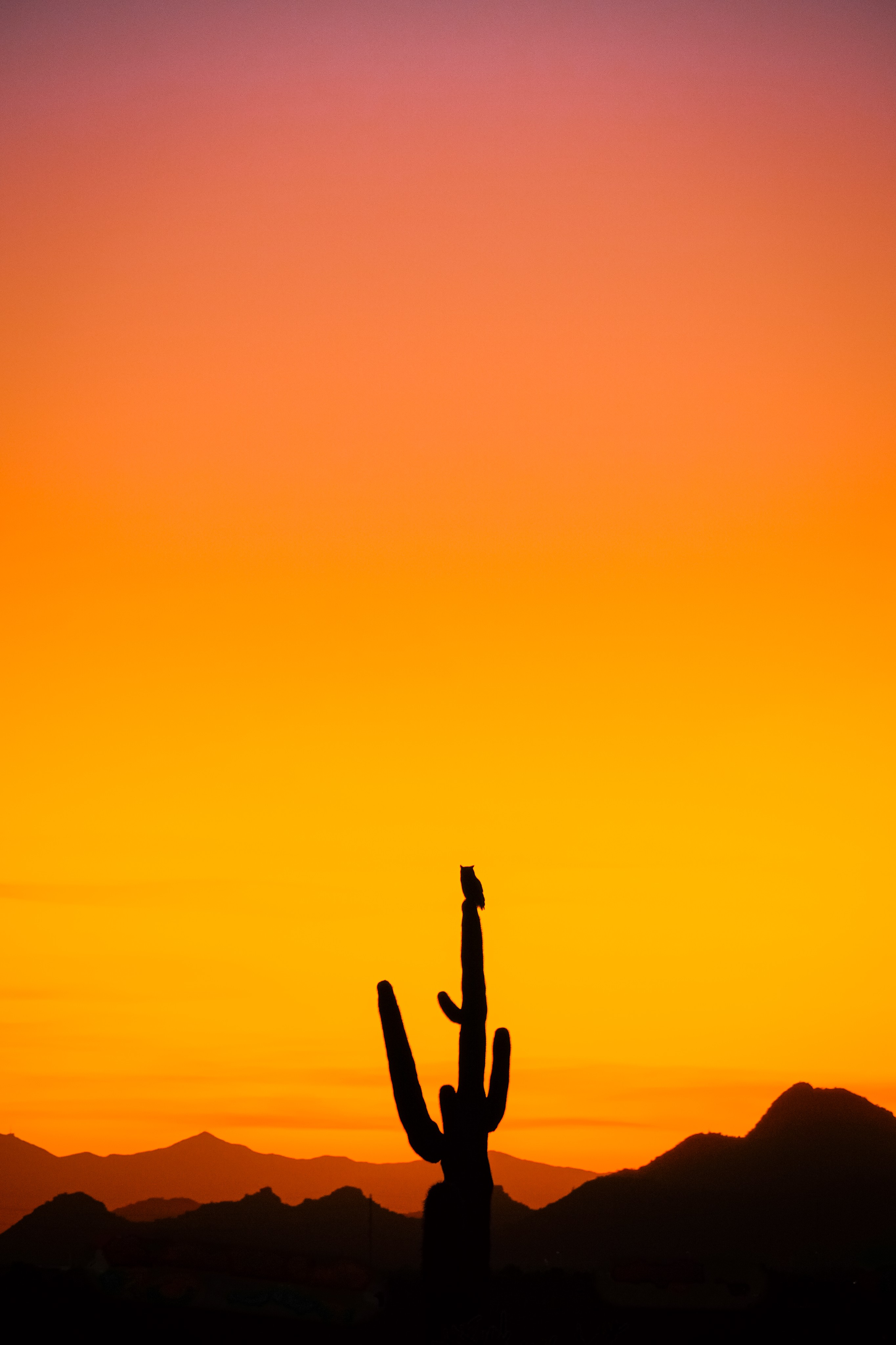 Great horned owl silhouette atop a saguaro at sunset